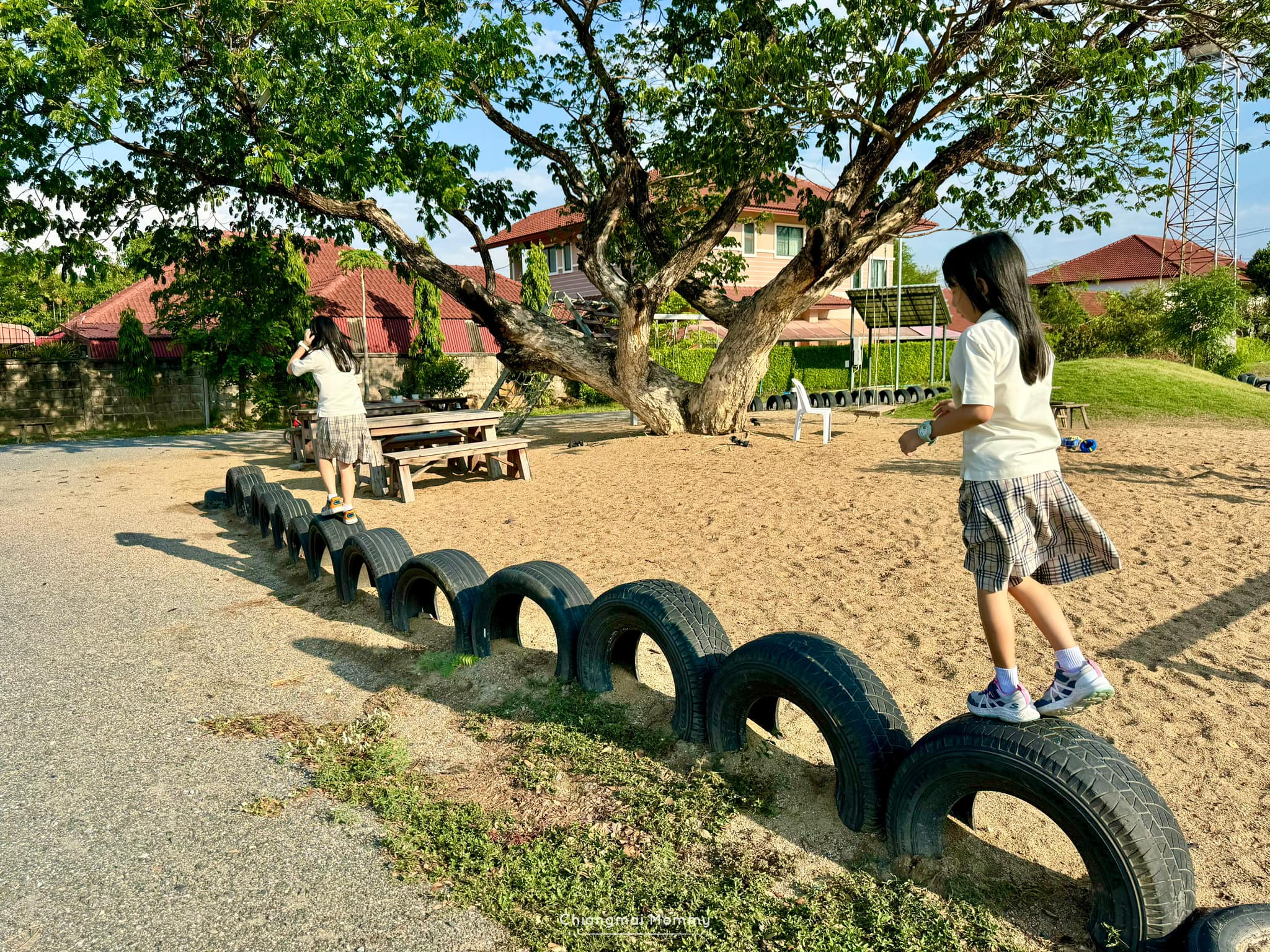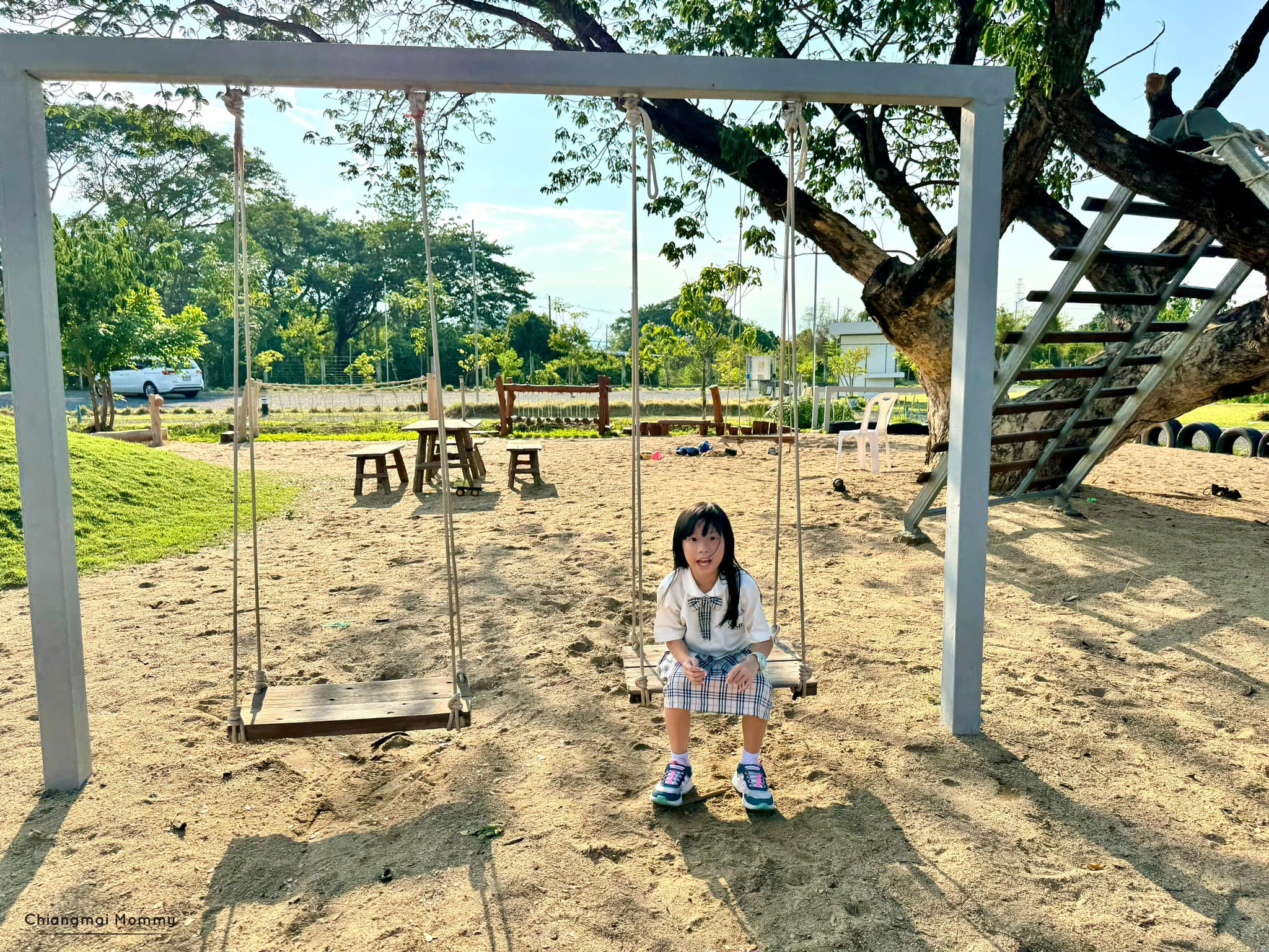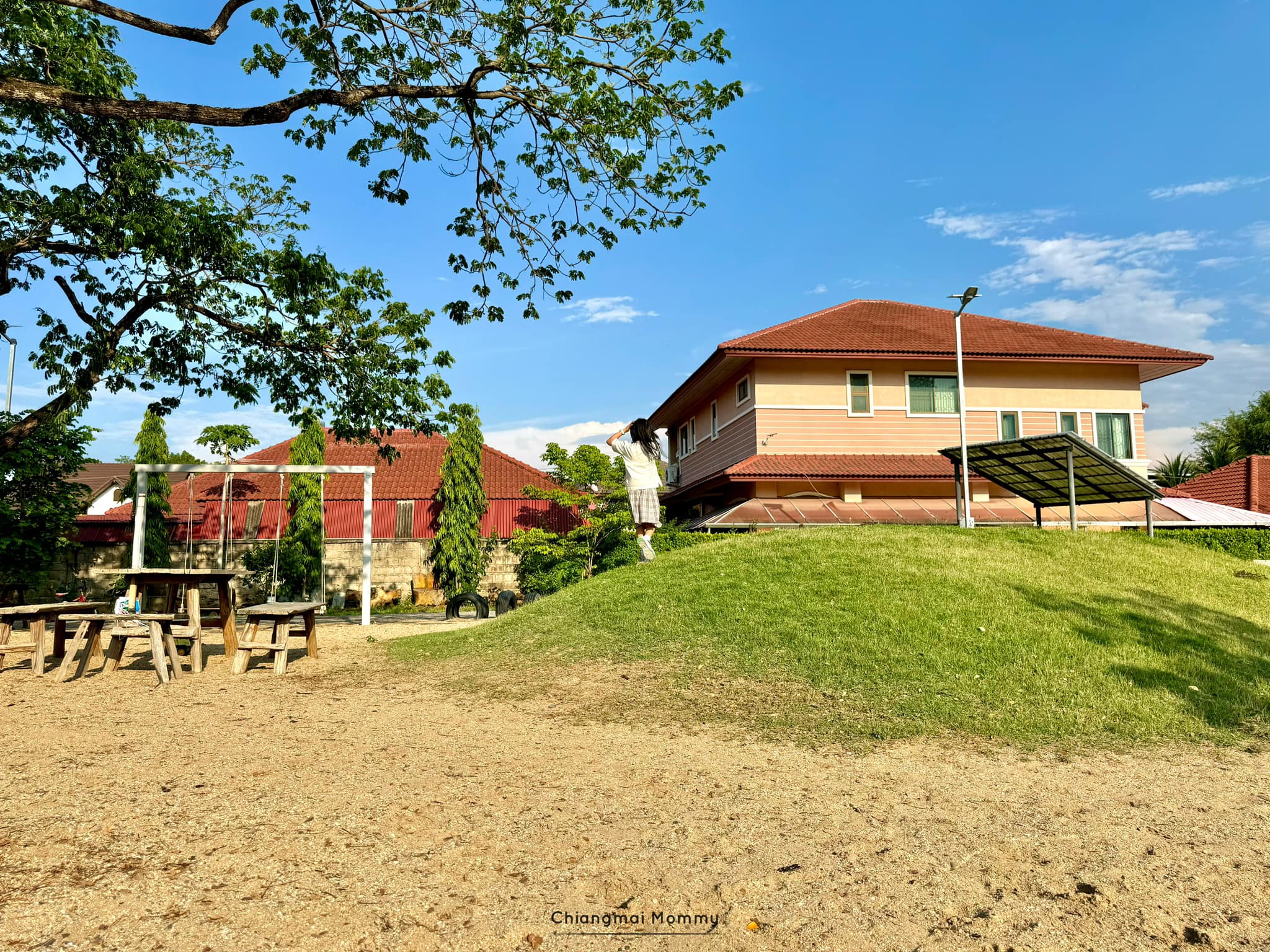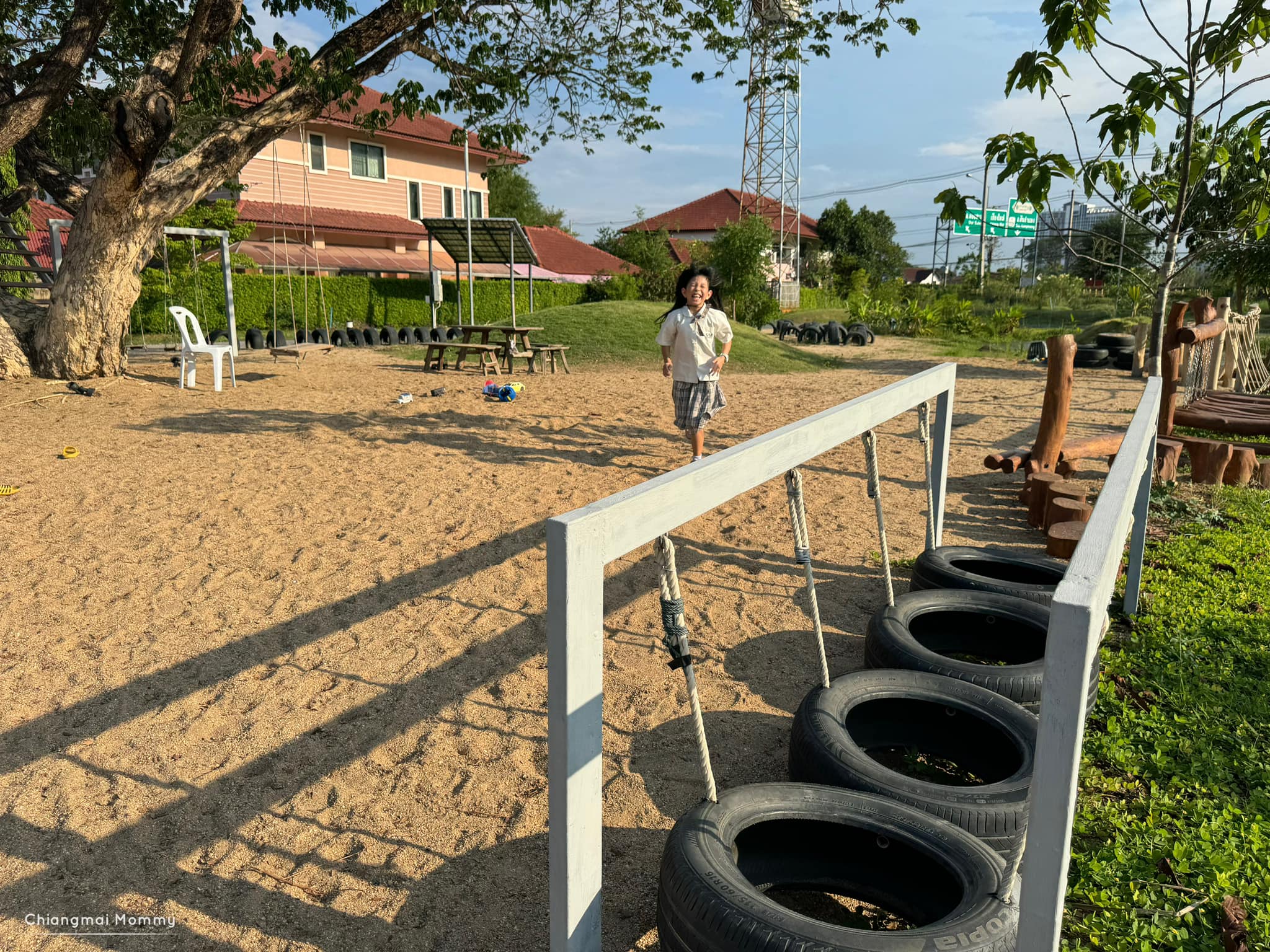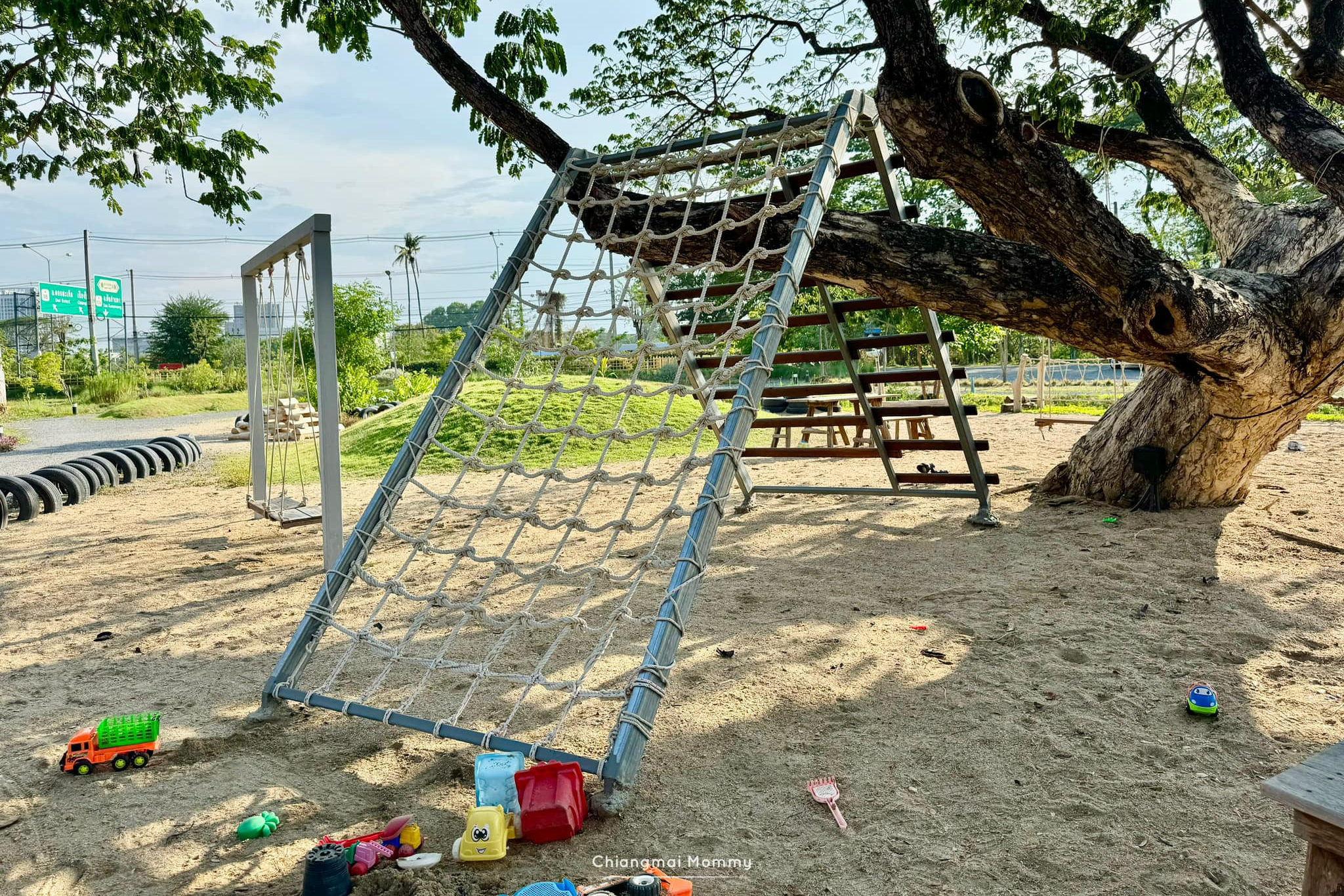 สนามเด็กเล่นที่นี่ มีบ่อทราย ของเล่นทราย จักรยาน ต้นไม้ ไต่เชือก ไต่ราว เดินทรงตัว ของเล่นตามธรรมชาติ เนินสนามหญ้า เด็กๆวิ่งเล่นสนุกเลยค่ะ