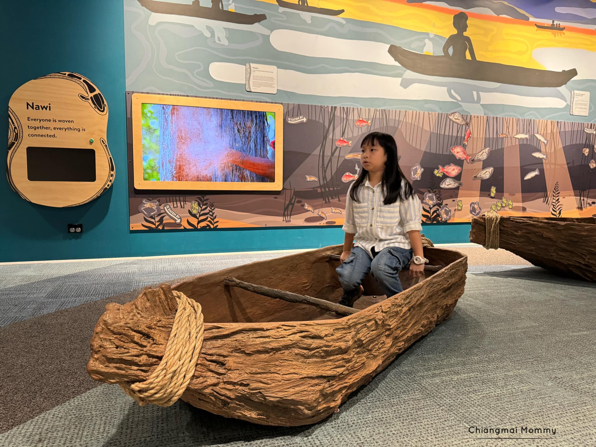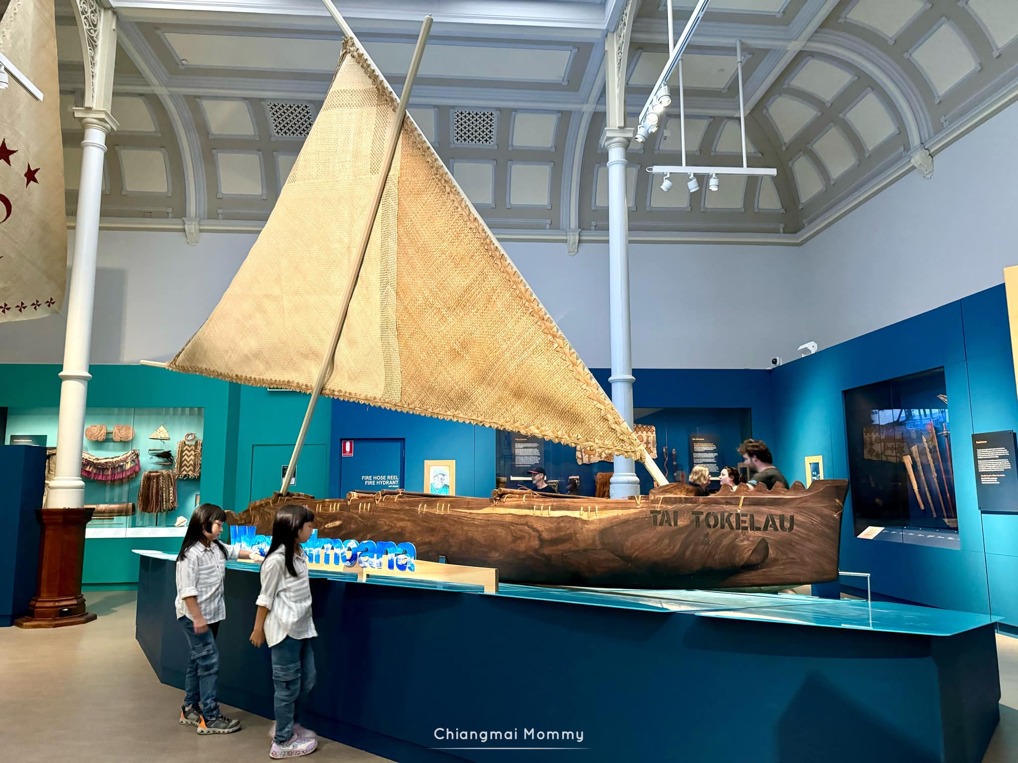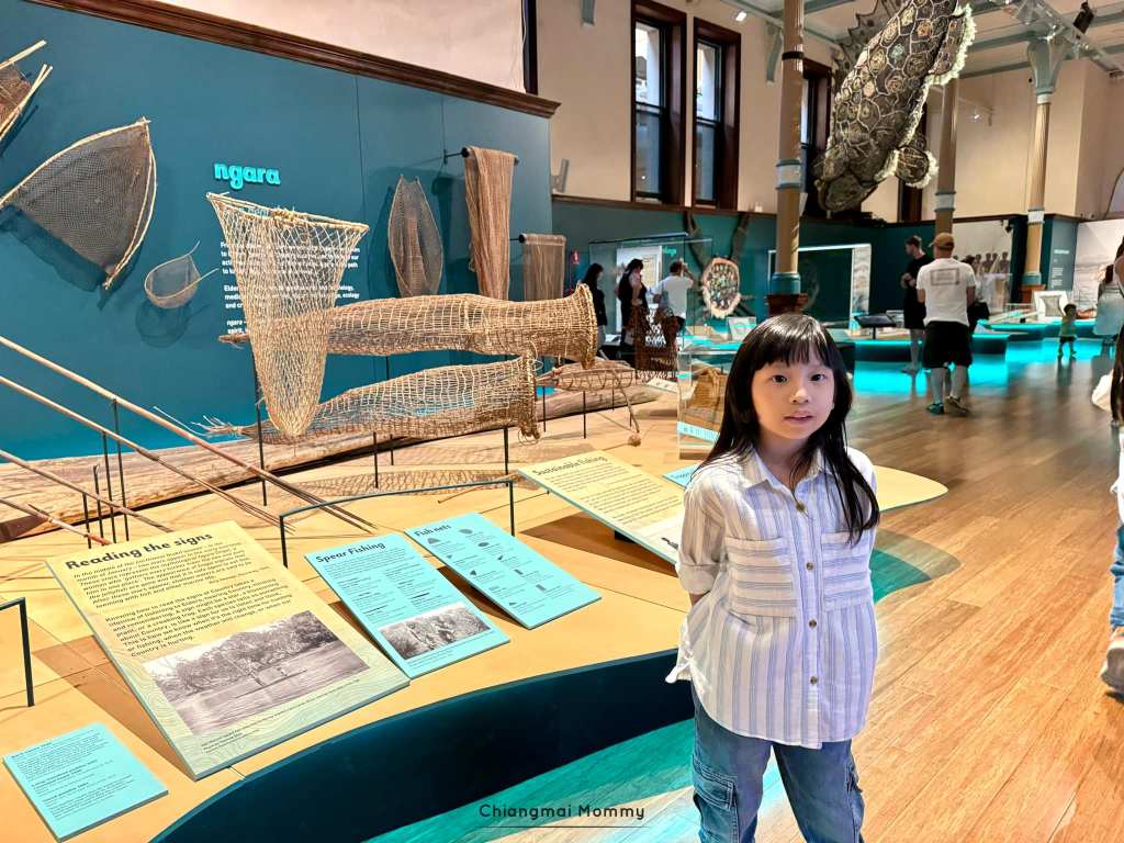 ตรงนี้จะแบ่งเป็นโซนๆ ห้องแรกคือ Australian animals จะมีสัตว์ประจำถิ่นของออสเตรเลียมาสตาฟตั้งโชว์ ต่อมาคือ First Nations Gallery ซึ่งจะมีเรื่องราวประวัติของชาวเผ่าพื้นเมือง ชีวิตความเป็นอยู่สมัยโบราณ โซนต่อมาคือ Dinosaurs จัดแสดงประวัติความเป็นมาของโลกยุคโบราณ การแยกตัวของแผ่นเปลือกโลก ไดโนเสาร์ที่พบในทวีปออสเตรเลีย ตรงนี้เด็กๆสนุกและตื่นเต้นมากค่ะ สุดท้ายเป็น The Westpac Long Gallery ซึ่งจะเป็นแกลอรี่ที่จัดแสดงสิ่งของหายาก ของมีค่าต่างๆ กว่า 100 showcase ว้าวกันมากเลยค่ะ