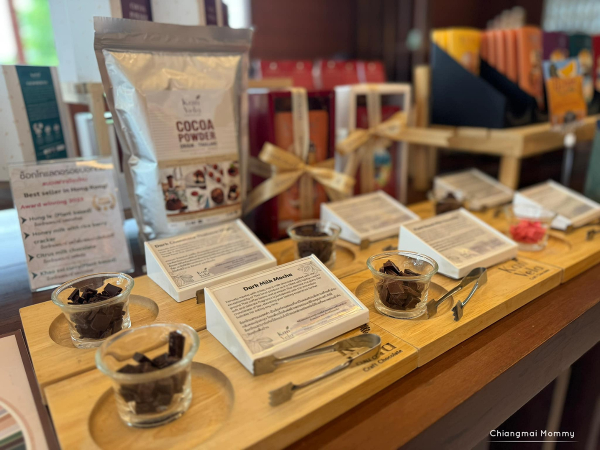 มีทั้งช็อกโกแลตบาร์ ช็อกโกแลตแปรรูป บองบอง ช็อกโกแลตสอดไส้ ที่สำคัญที่นี่คือมีรสชาติให้เลือกเยอะมว๊ากกกก ที่เป็นเอกลักษณ์ก็คือ…รสของฝากเชียงใหม่ ช็อกโกแลตรสข้าวซอย!! รสแกงฮังเล!! ต้องลองค่ะ แปลกไม่ซ้ำใครในโลก
