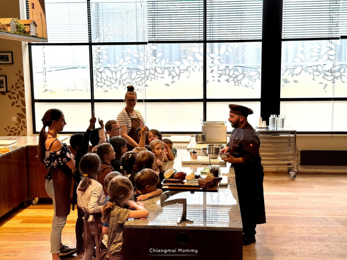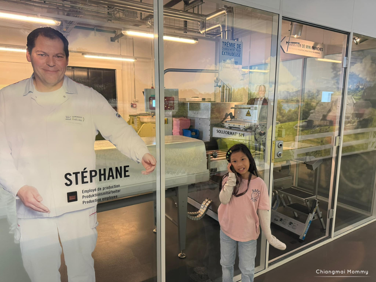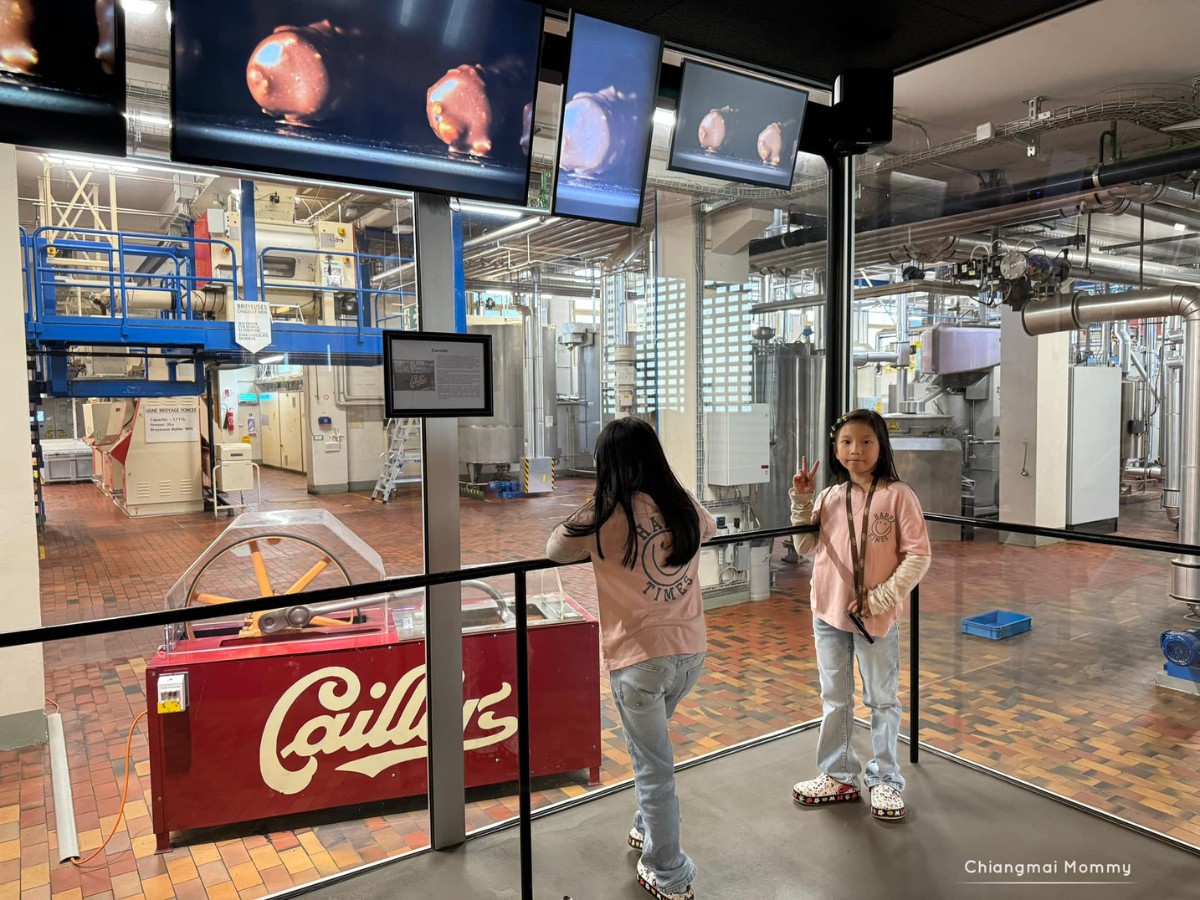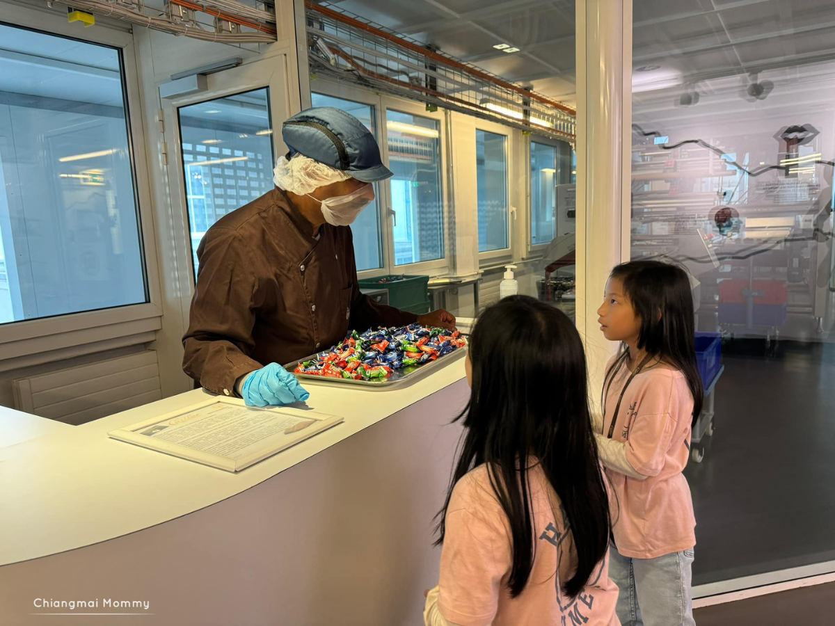 จากนั้นก็จะเข้าชมต่อยังส่วนวัตถุดิบ รสชาติต่างๆแบะเข้าสู่ส่วนโรงงานผลิตช็อกโกแลต ที่สะอาดมาก ตรงนี้จะมีกระจกกั้นนะคะ แต่จะเห็นขั้นตอนการผลิตที่เด็กๆเห็นแล้วว้าวมากๆ ตั้งแต่ผลิต แพค ห่อ ซึ่งพอถึงปลายสายการผลิตเราก็จะได้ช็อกโกแลตที่ผลิตใหม่ๆติดมือมาด้วย ซึ่งคุณลุงที่ดูแลนี่โกยใส่กระเป๋าให้เด็กๆอย่างเยอะ ![]()