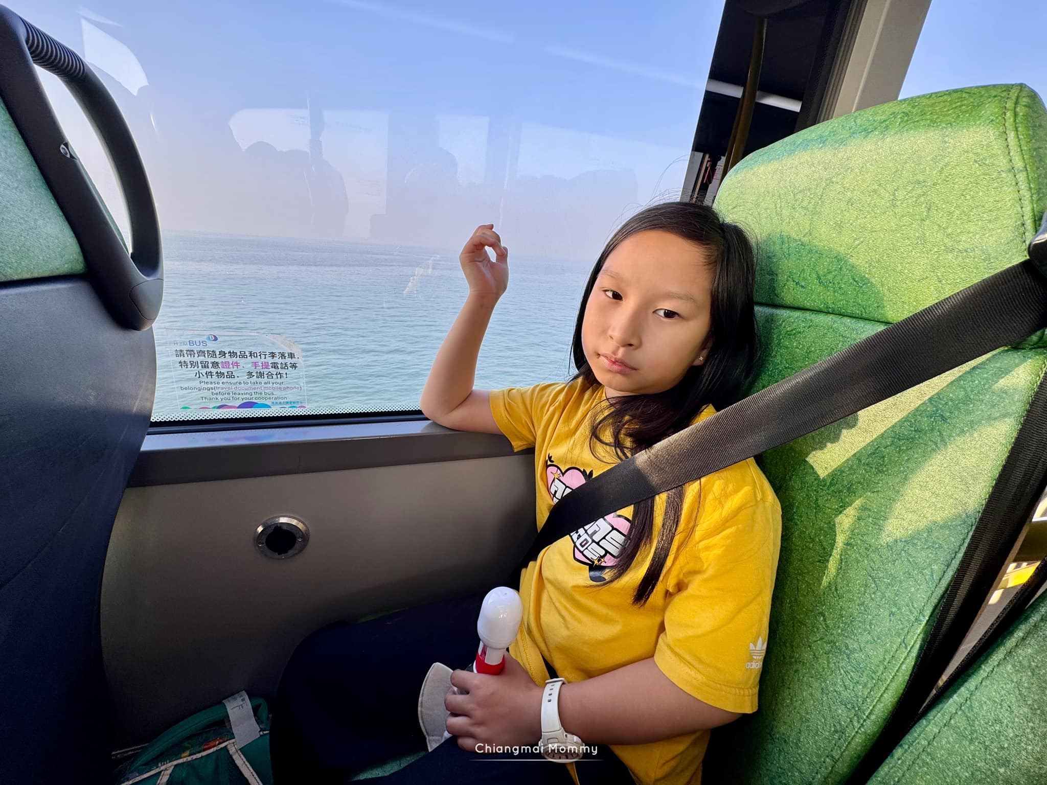 เส้นทางจะมีช่วงสะพานข้ามทะเลและลอดอุโมงค์ใต้ทะเล นั่งประมาณ 45 นาทีจะถึงอีกฝั่ง Macao HZMB Port รถบัสแบบนี้คือ Shuttle Bus ของ HZM bus ค่ะ