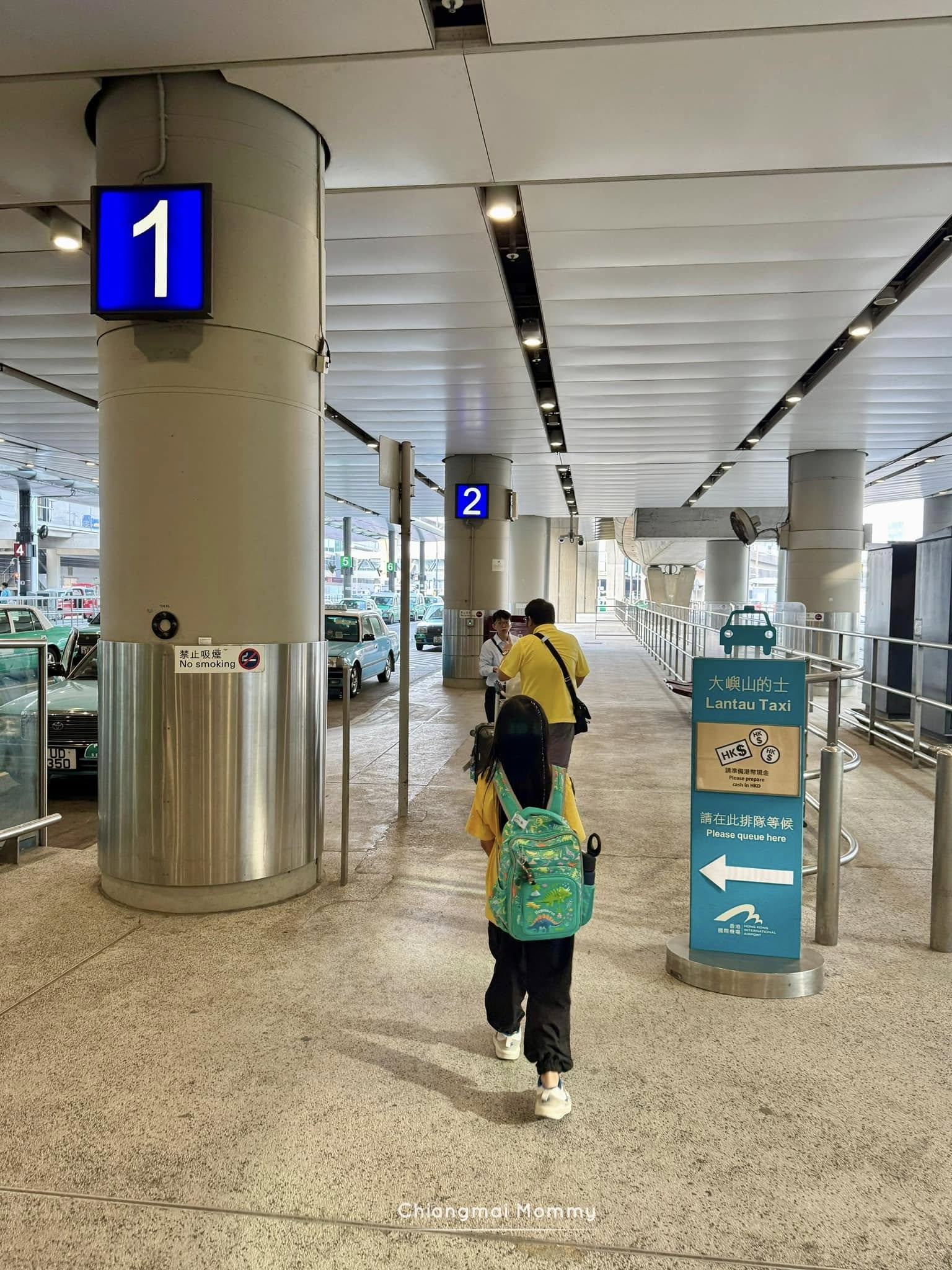เมื่อออกจากสนามบินฮ่องกง เราเดินตามป้าย Taxi เลือกแท็กซี่แถวสีฟ้าที่เขียนว่า Lantau บอกไปด่าน HZMB ใช้เวลาประมาณ 5-10 นาทีก็ถึงด่านค่ะ หรือจะนั่งรถเมล์สาย B4 มาลงก็ได้ค่ะ