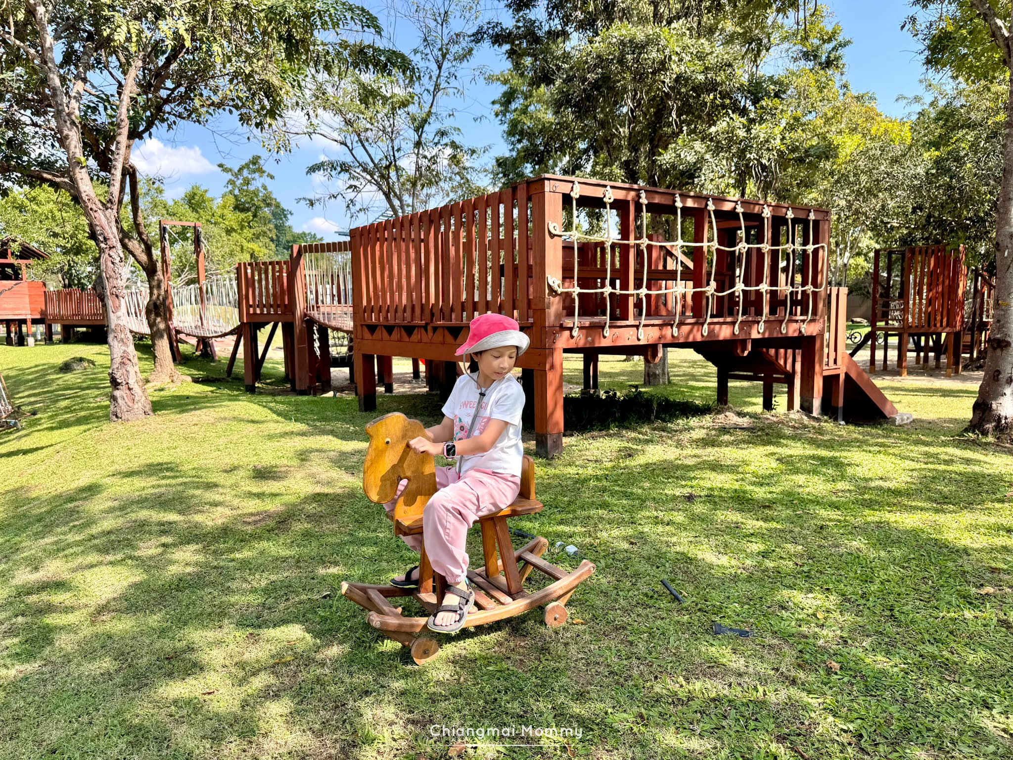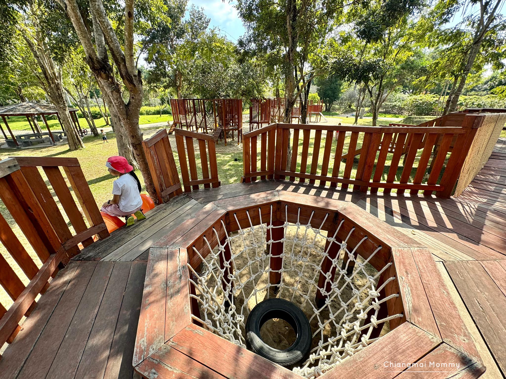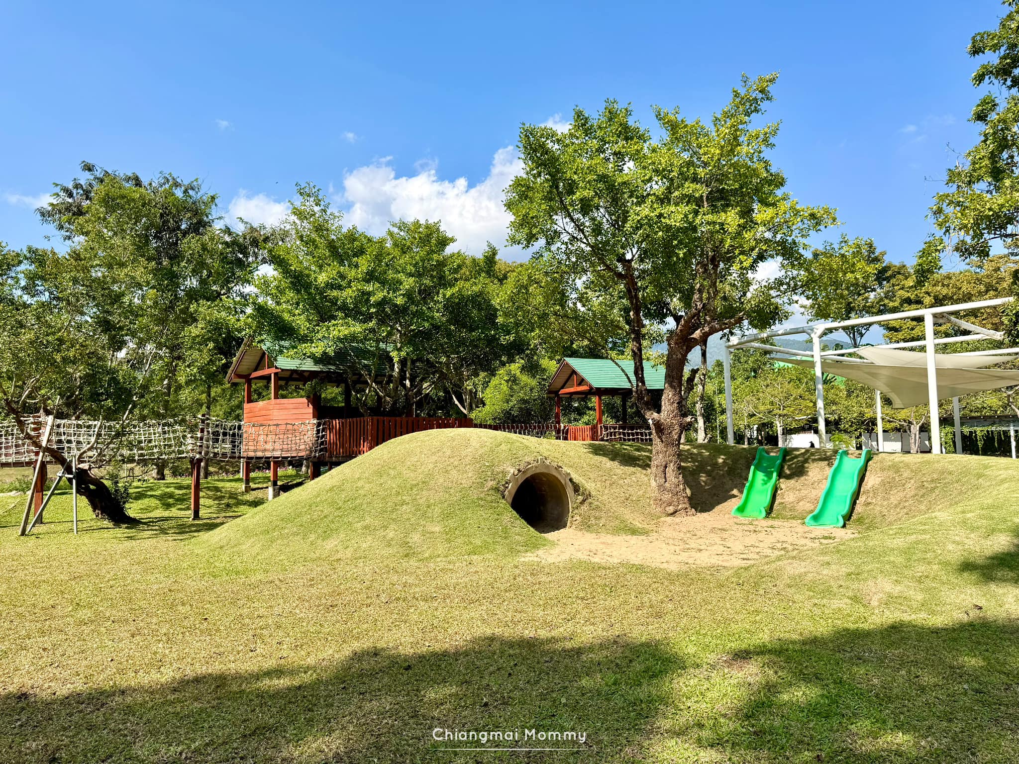 มีทั้งสวนพืชผักพื้นบ้าน ของเล่นปีนป่าย สไลเดอร์ บ่อทราย บ้านต้นไม้ สนามหญ้าวิ่งเล่นเนินสูงต่ำ โดมต้นไม้ ชิงช้า เขาวงกต และของเล่นเด็กต่างๆ เพียบ