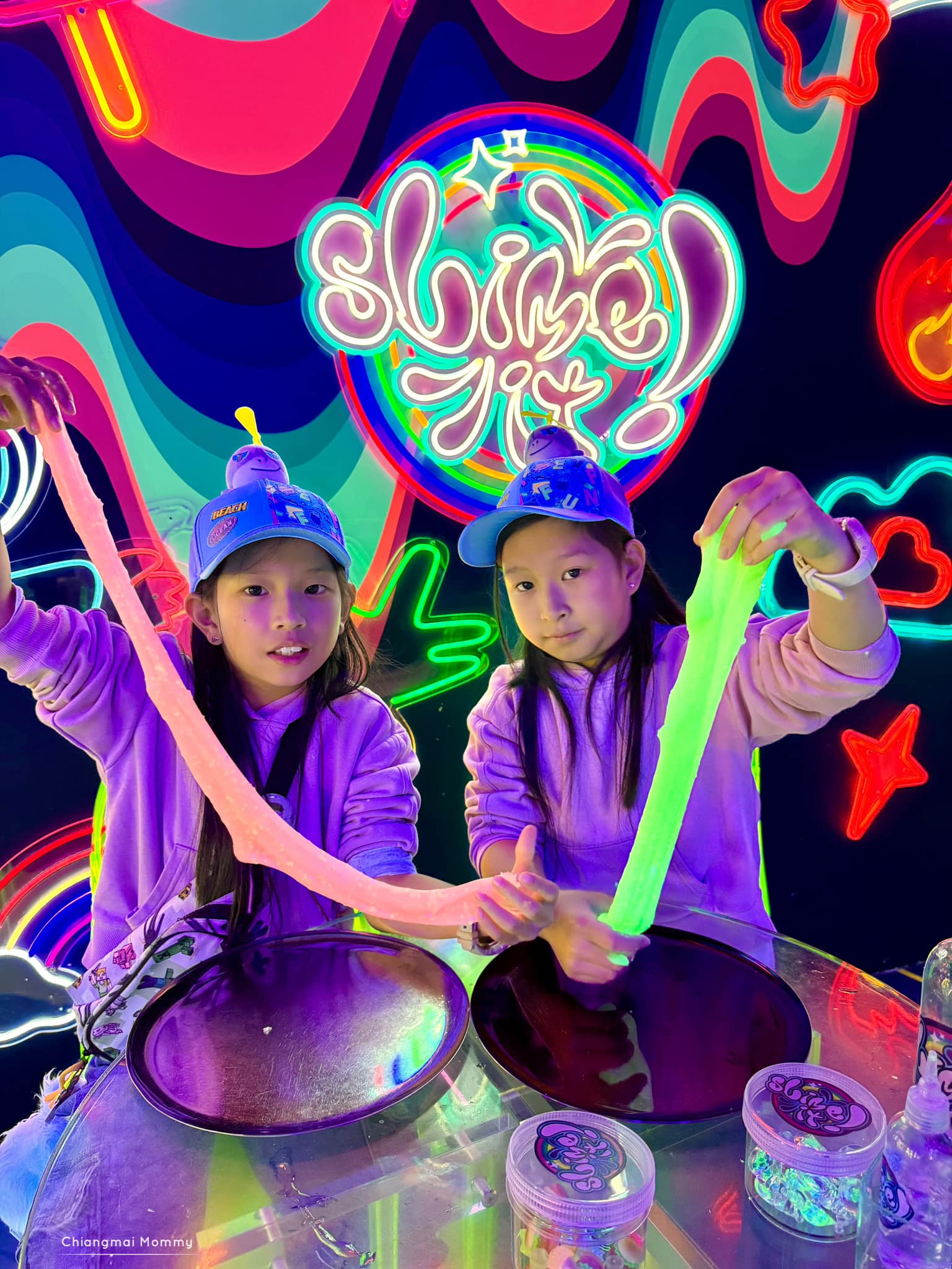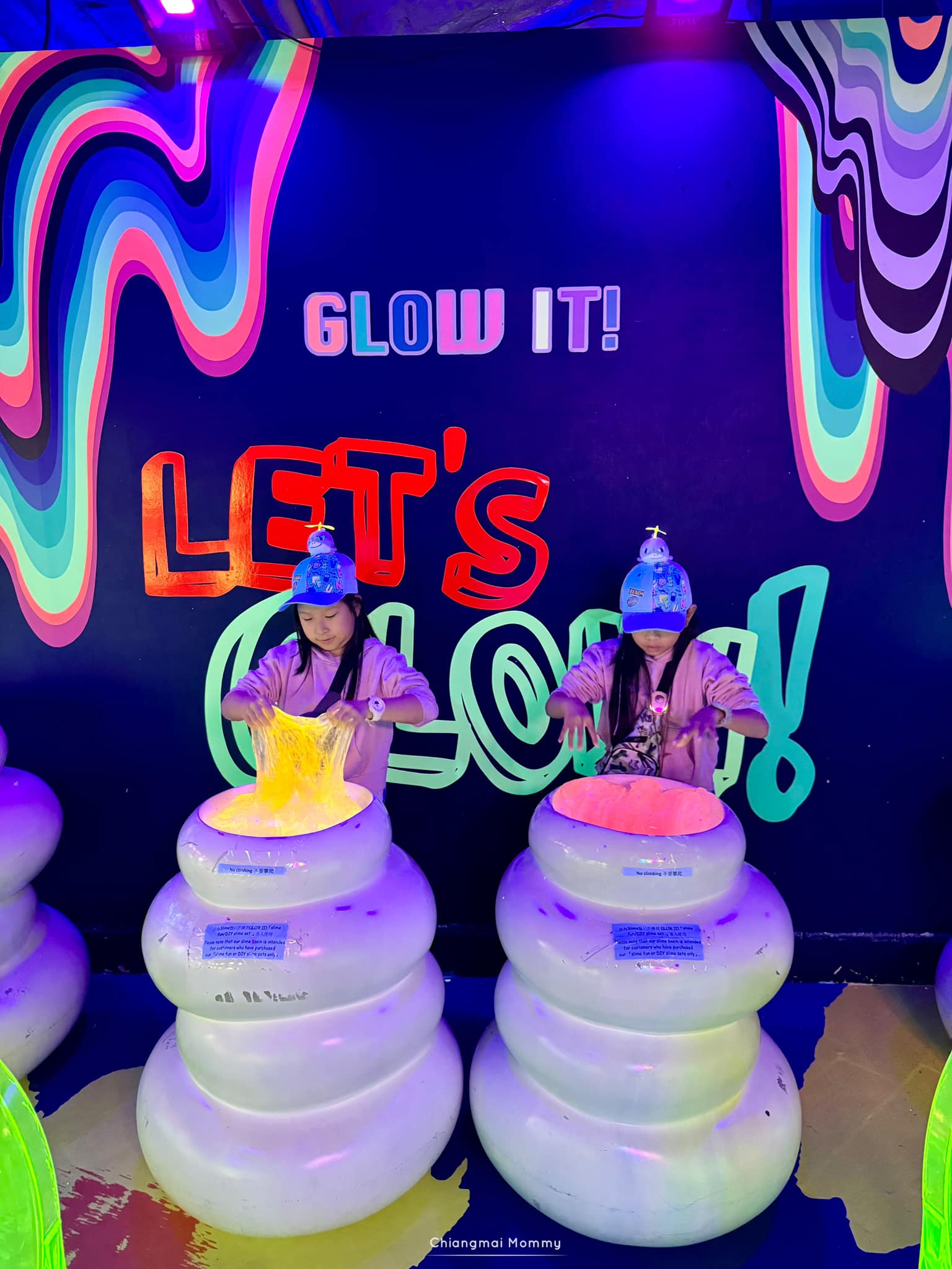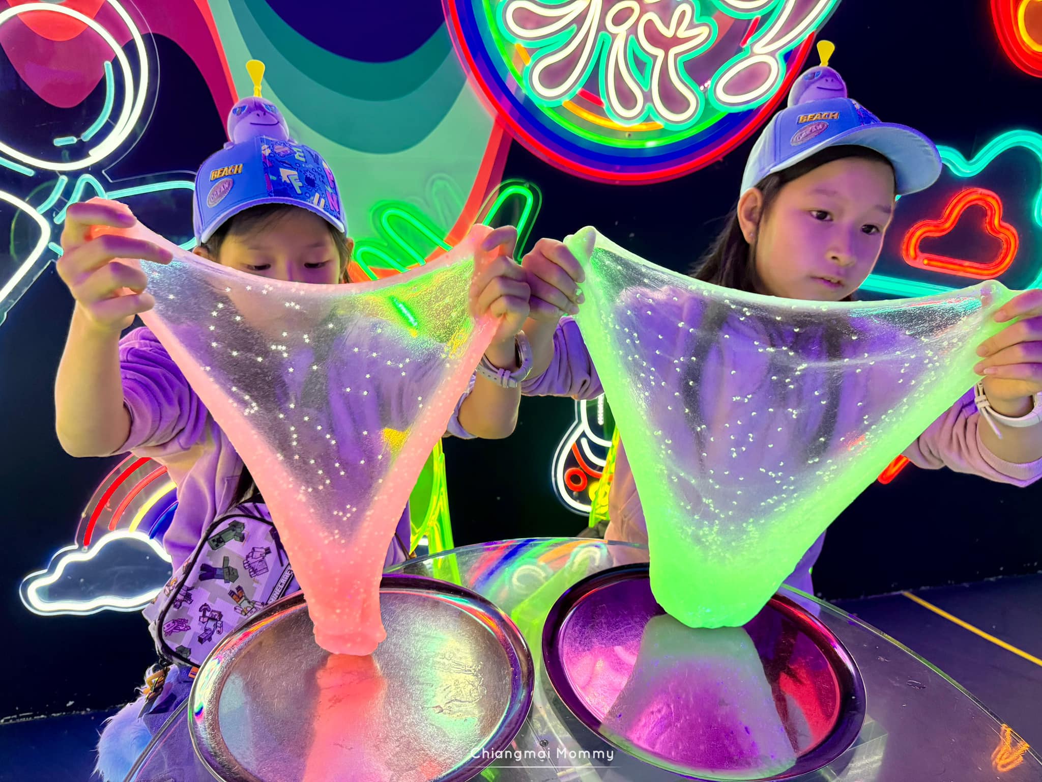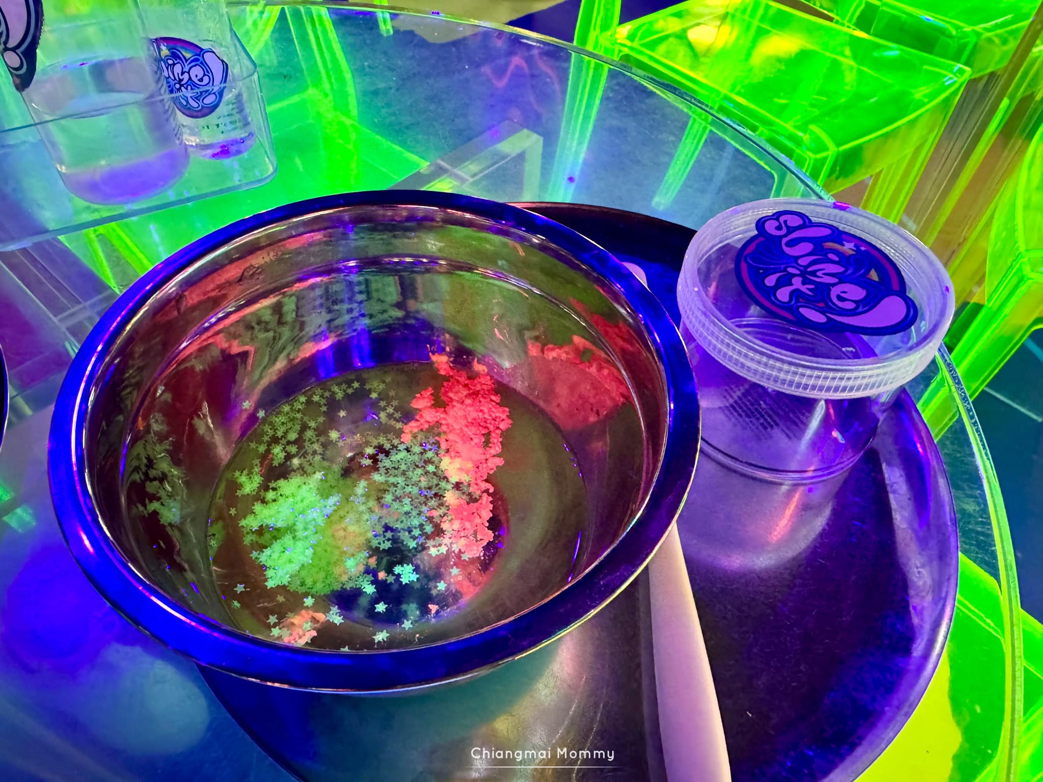 ที่นี่จะให้เด็กๆเลือกทำสไลม์ตามแบบของตัวเองค่ะ โดยจะให้เลือกสี เลือกกลิตเตอร์ เลือกกลิ่น และ Charm ที่ชอบ 1 กล่อง ซึ่งส่วนตัวแม่ว่าสนุกมว๊ากกก เราสามารถกำหนดความเหนียวยืดของสไลม์ได้จะเอาแบบแข็งหรือแบบเหลวยืด มีน้ำยาและตัวปรับแต่งให้ปรุงสูตรตามความพอใจของเรา พอทำเสร็จก็สามารถเล่นโถสไลม์เรืองแสงได้ด้วย ตรงนี้สนุกมากเพราะสไลม์เยอะและยืดมากๆ