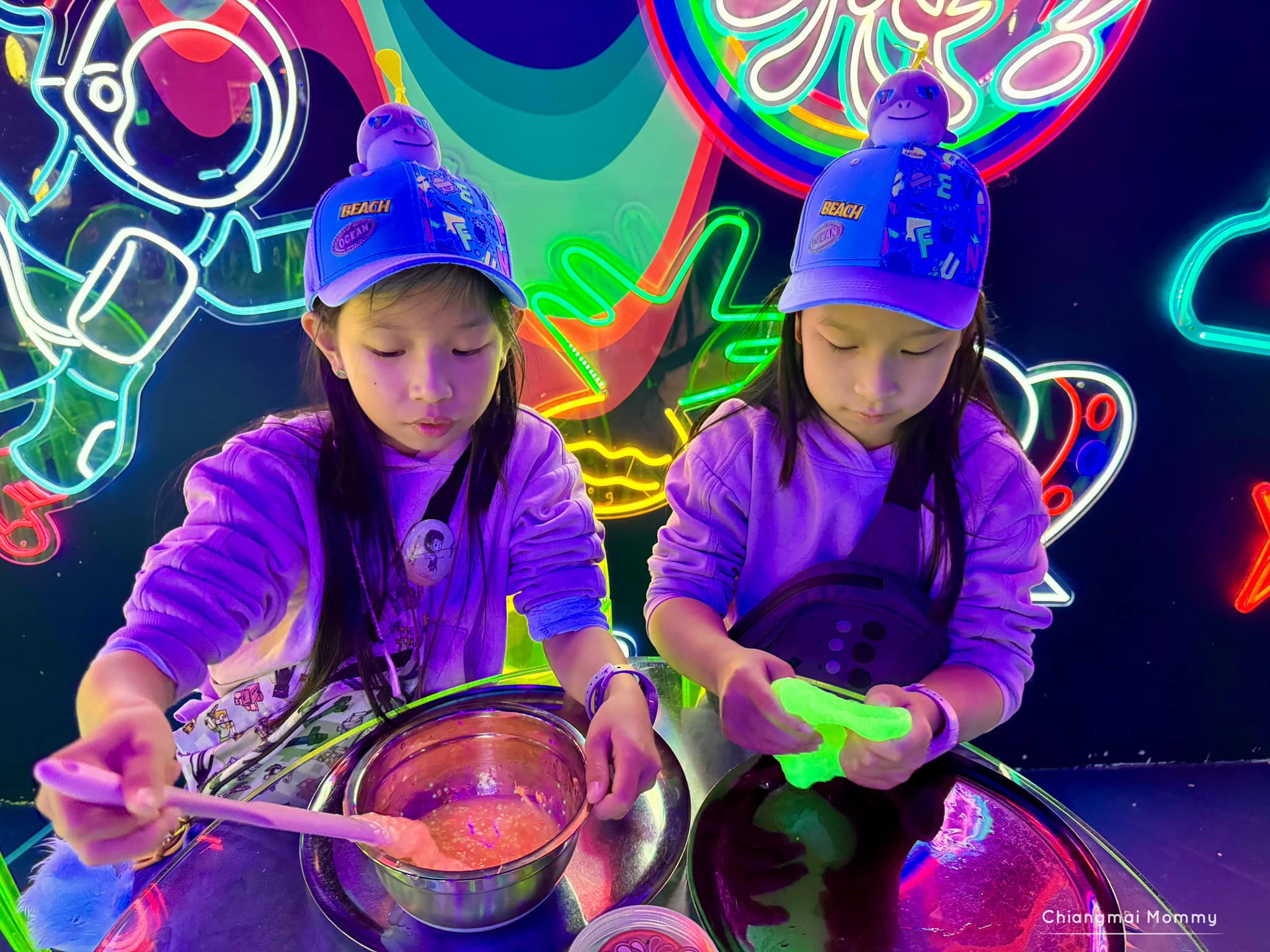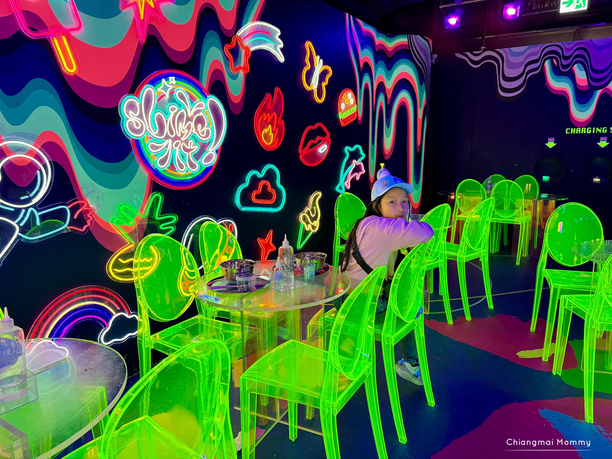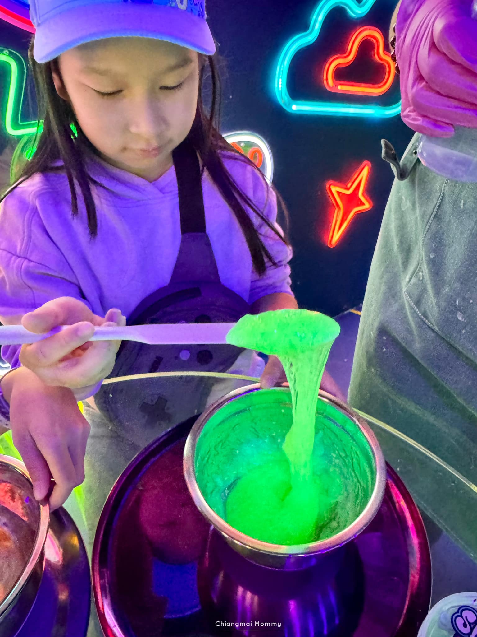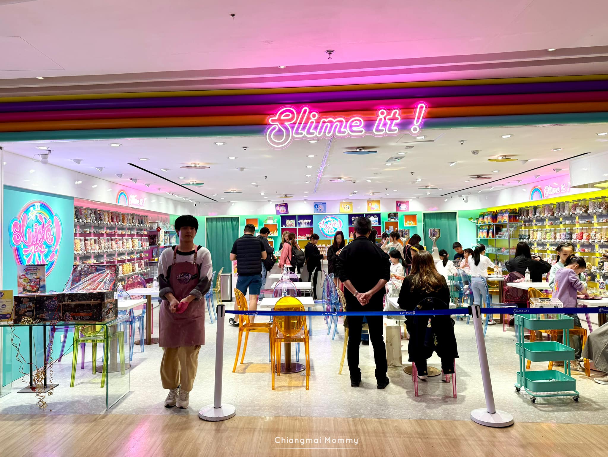 ที่นี่จะให้เด็กๆเลือกทำสไลม์ตามแบบของตัวเองค่ะ โดยจะให้เลือกสี เลือกกลิตเตอร์ เลือกกลิ่น และ Charm ที่ชอบ 1 กล่อง ซึ่งส่วนตัวแม่ว่าสนุกมว๊ากกก เราสามารถกำหนดความเหนียวยืดของสไลม์ได้จะเอาแบบแข็งหรือแบบเหลวยืด มีน้ำยาและตัวปรับแต่งให้ปรุงสูตรตามความพอใจของเรา พอทำเสร็จก็สามารถเล่นโถสไลม์เรืองแสงได้ด้วย ตรงนี้สนุกมากเพราะสไลม์เยอะและยืดมากๆ