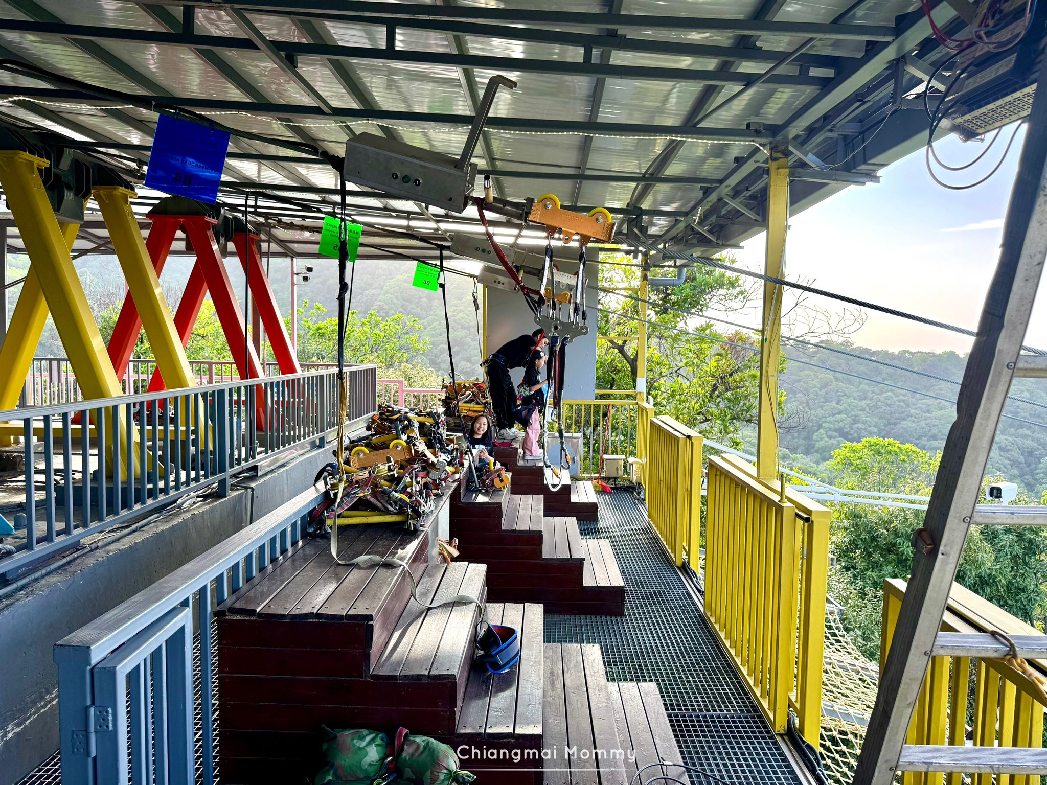 Zipline นี้ด้วยความที่ระยะยาวมากจึงแบ่งเป็น 2 ครั้ง จากจุดบนสุดกระโดดไปจุดพักตรงกลางก่อน เส้นนี้วิวป่าเขาล้วนๆ สูงมาก แม่ไม่กล้าขยับไม่กล้าถ่ายรูป
