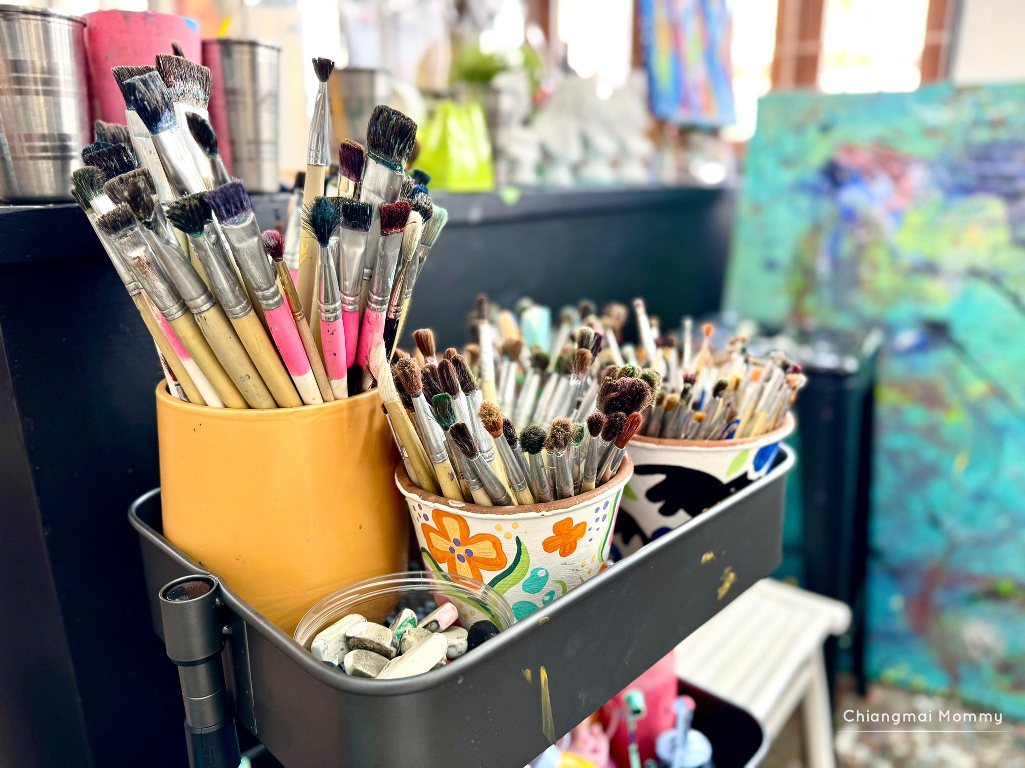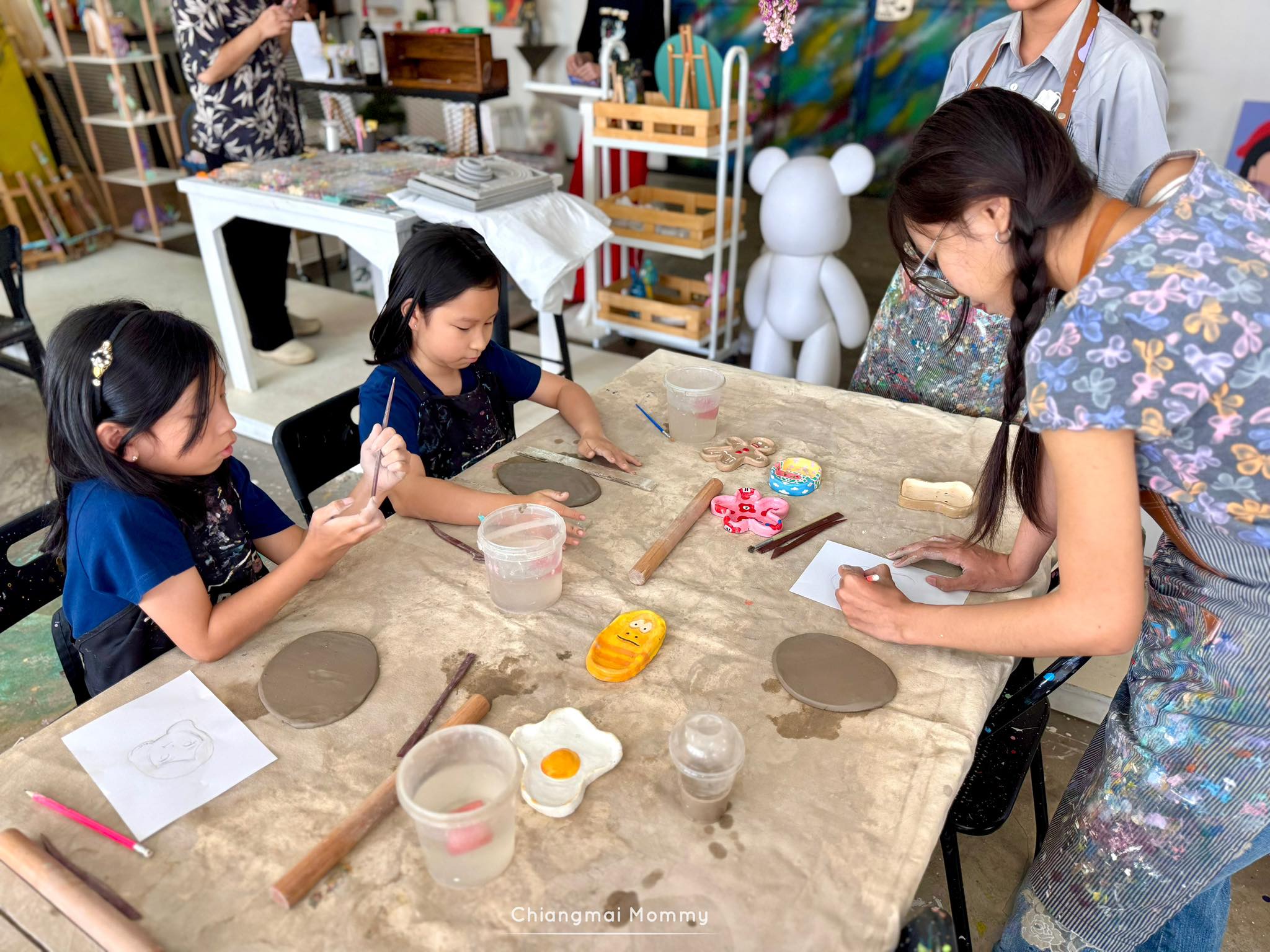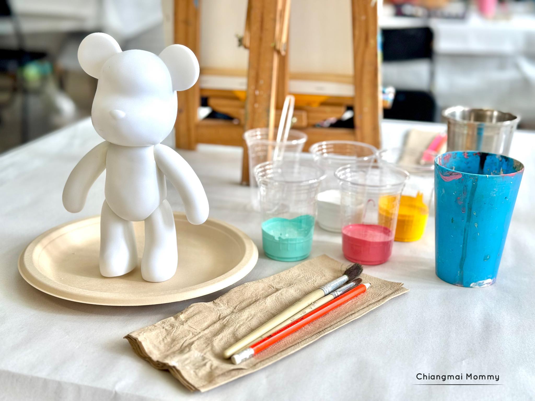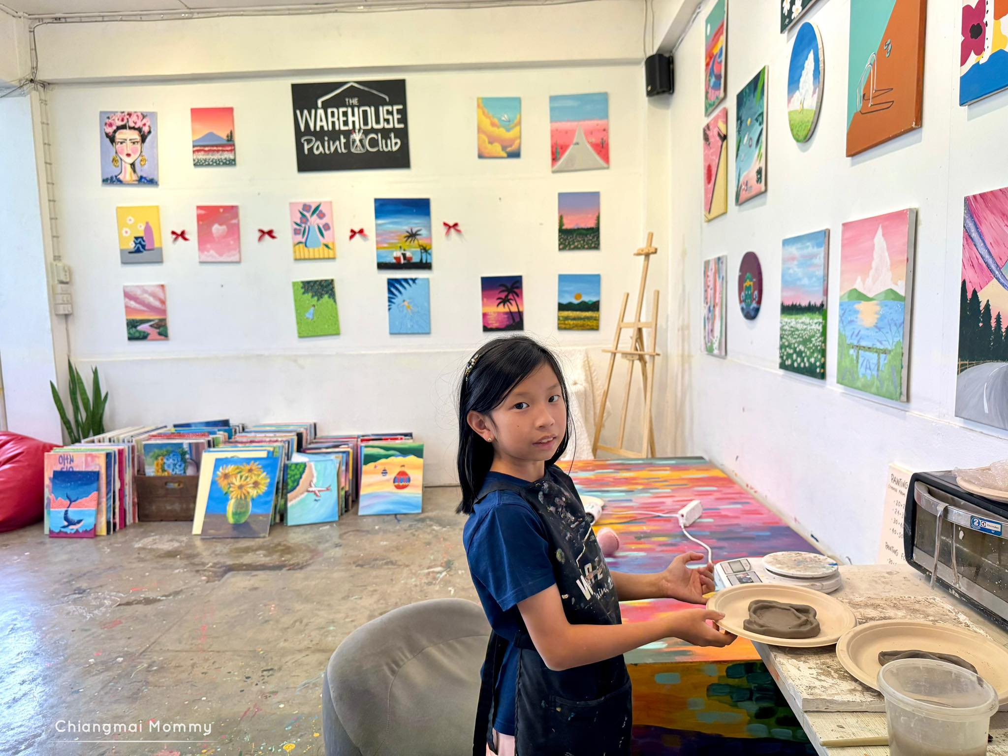 ที่นี่มีกิจกรรมให้เลือกเยอะมากทั้งระบายสีบนเฟรมขนาดต่างๆ งานเทสีหมี ร้อยลูกปัด งานปั้นดินเหนียวพร้อมเพนท์สี เพนท์กระเป๋าผ้ารักษ์โลก ซึ่งทุกคลาสมีคุณครูใจดีช่วยสอนเทคนิคการทำงานศิลปะให้ด้วย คุณครูสอนเข้าใจง่ายและสนุกถูกใจลูกเลย การได้มาทำงานศิลปะแบบนี้ลูกจะใจเย็น เพราะบางชิ้นงานต้องใช้เวลา อดทนและรอคอยกว่าผลงานจะสำเร็จค่ะ บางงานได้กลับบ้านเลย บางงานต้องกลับมาทำต่อ ที่นี่สามารถฝากงานไว้ได้ค่ะ ว่างเมื่อไรค่อยมาทำต่อ