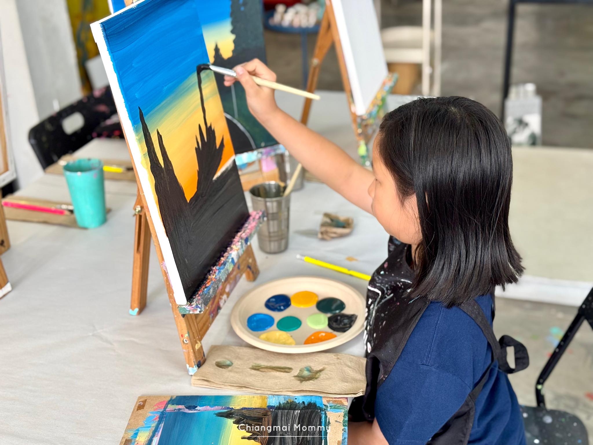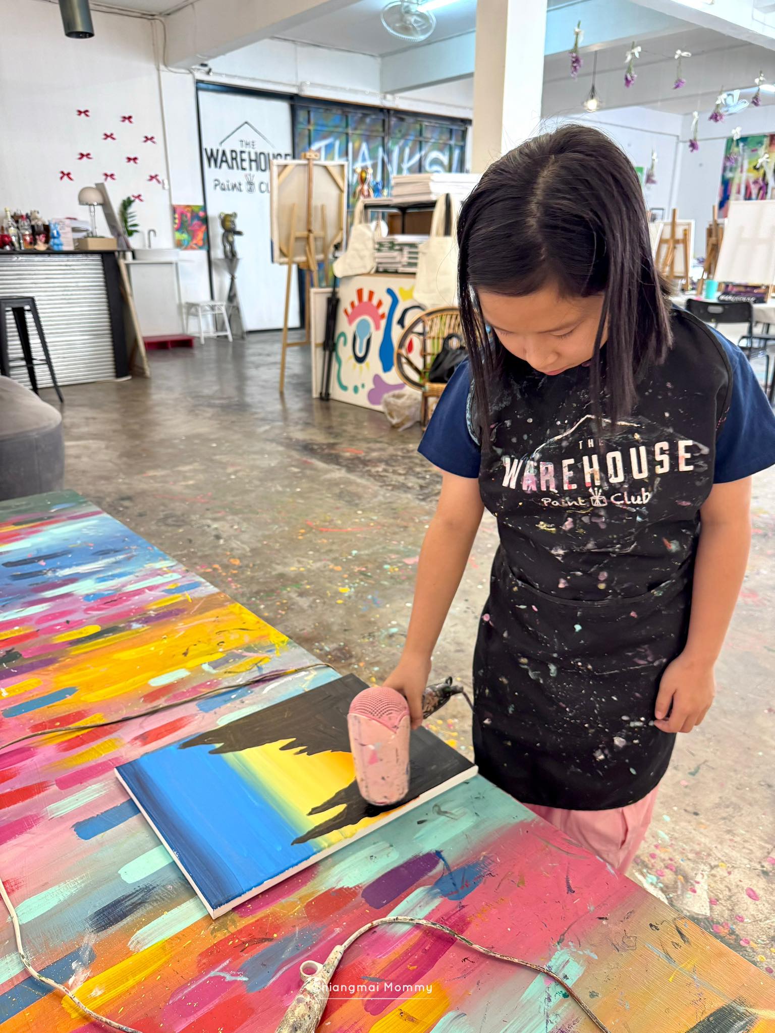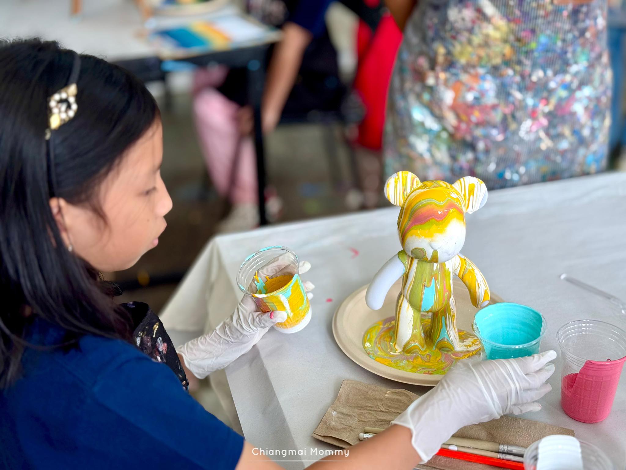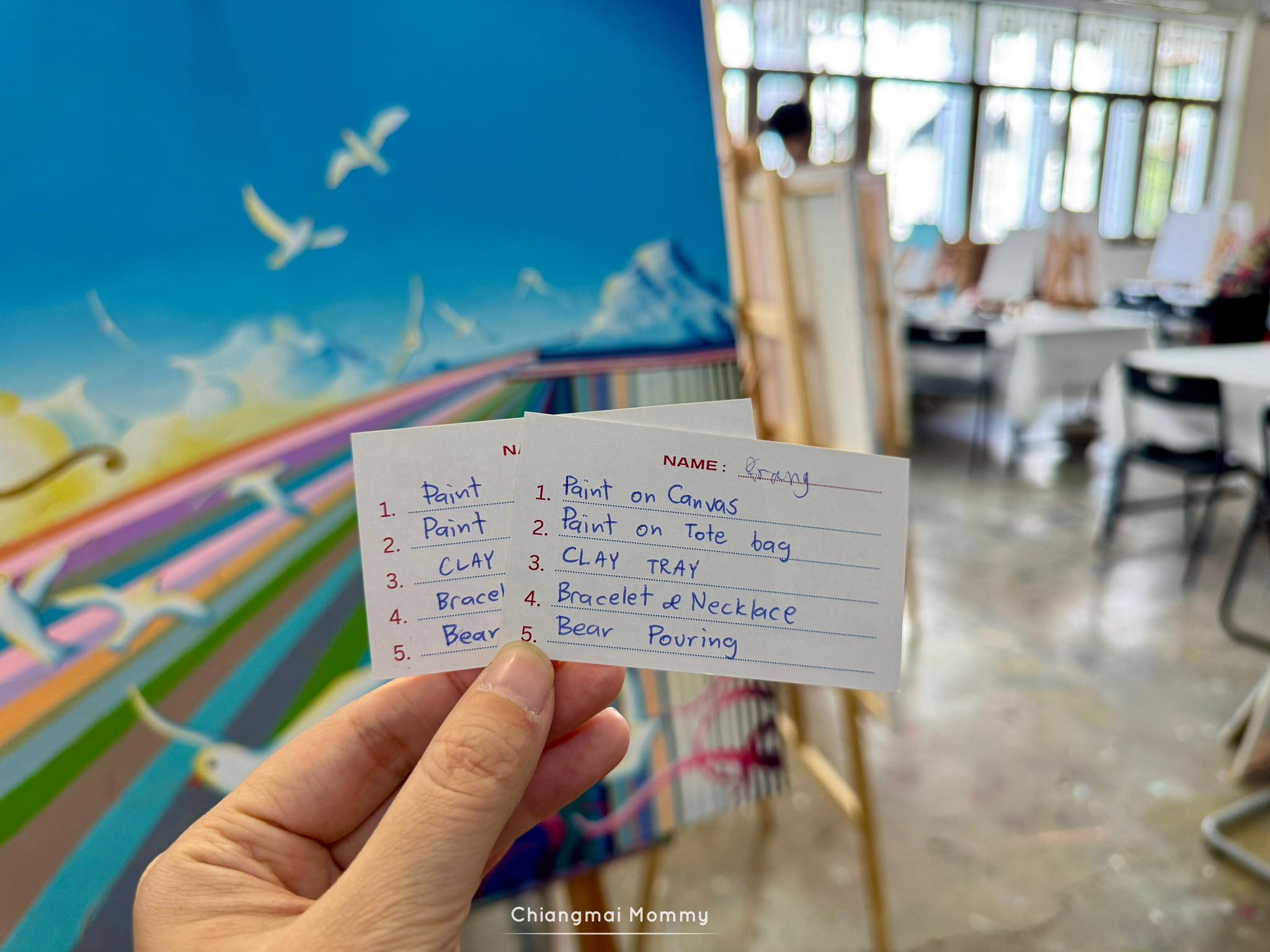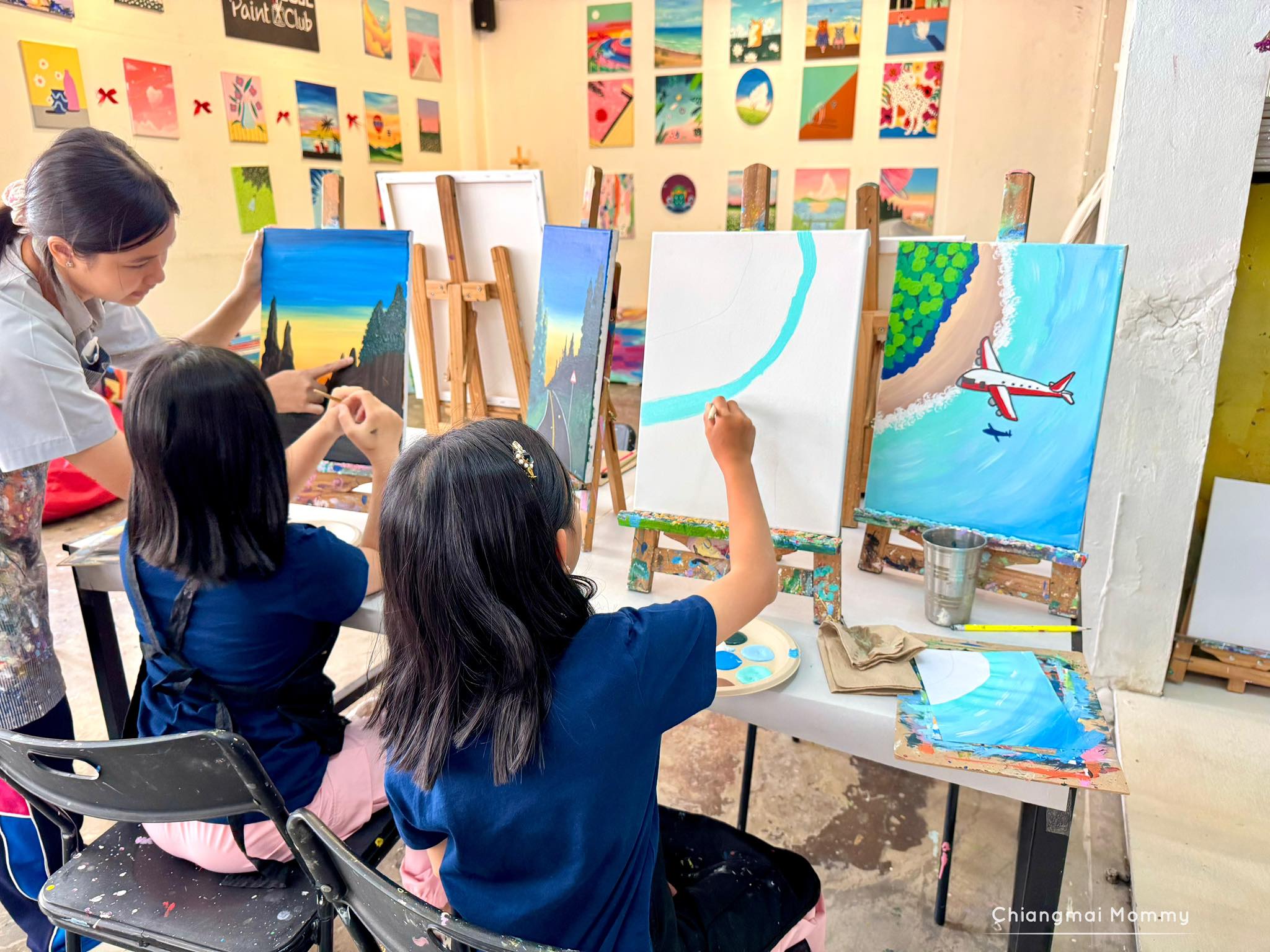 ที่นี่มีกิจกรรมให้เลือกเยอะมากทั้งระบายสีบนเฟรมขนาดต่างๆ งานเทสีหมี ร้อยลูกปัด งานปั้นดินเหนียวพร้อมเพนท์สี เพนท์กระเป๋าผ้ารักษ์โลก ซึ่งทุกคลาสมีคุณครูใจดีช่วยสอนเทคนิคการทำงานศิลปะให้ด้วย คุณครูสอนเข้าใจง่ายและสนุกถูกใจลูกเลย การได้มาทำงานศิลปะแบบนี้ลูกจะใจเย็น เพราะบางชิ้นงานต้องใช้เวลา อดทนและรอคอยกว่าผลงานจะสำเร็จค่ะ บางงานได้กลับบ้านเลย บางงานต้องกลับมาทำต่อ ที่นี่สามารถฝากงานไว้ได้ค่ะ ว่างเมื่อไรค่อยมาทำต่อ