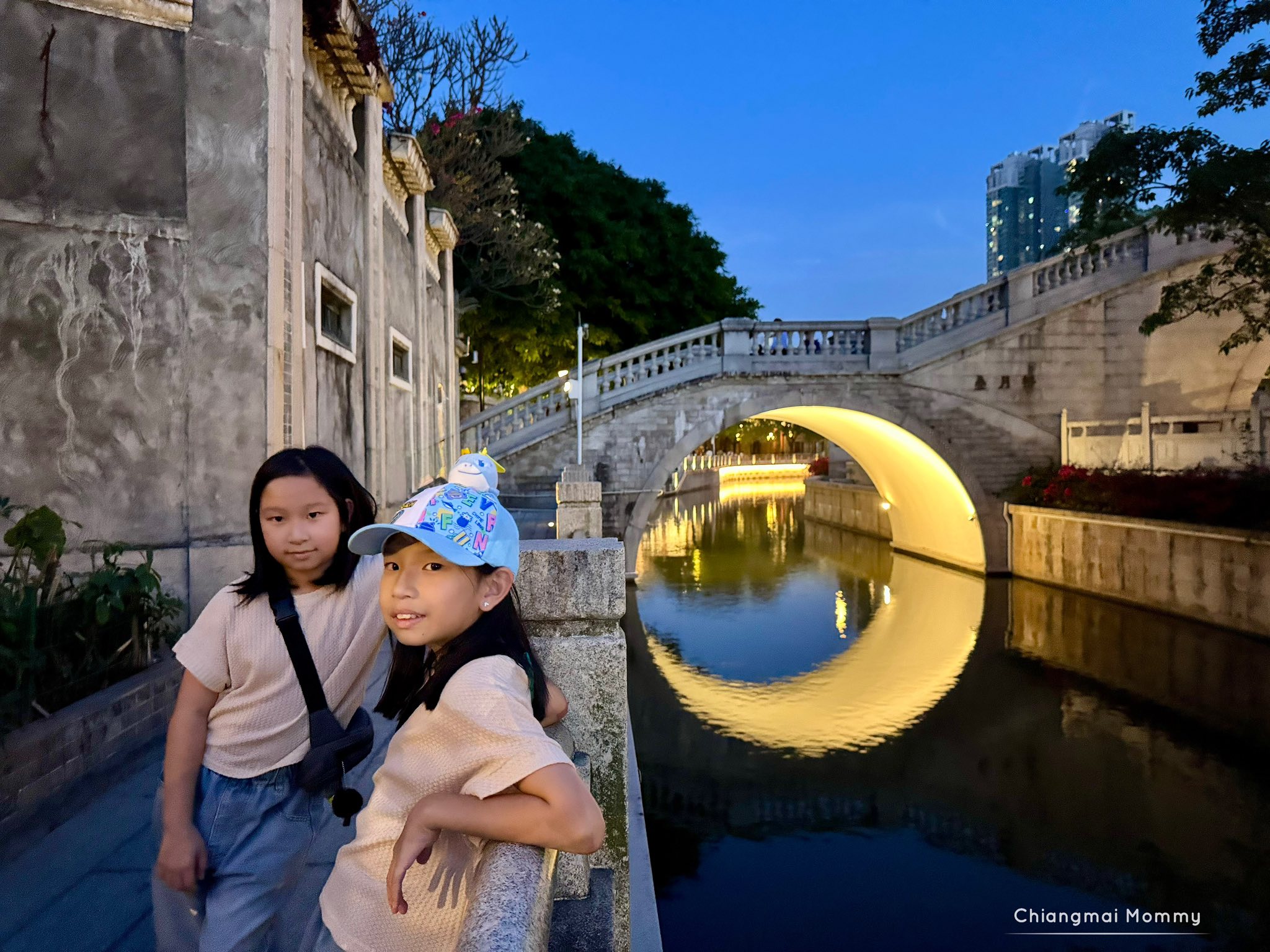 เสน่ห์เมืองเก่ากว่างโจว ร่องรอยประวัติศาสตร์ผสมผสานความทันสมัย ซึ่งตรงนี้จะมีสะพานพระจันทร์ซึ่งจะเป็นแสงไฟสะท้อนใต้สะพาน ดังนั้นมาช่วงเย็นๆจนถึงดึกได้เลยนะคะ จะได้ชมบรรยากาศตอนเปิดไฟสวยๆ