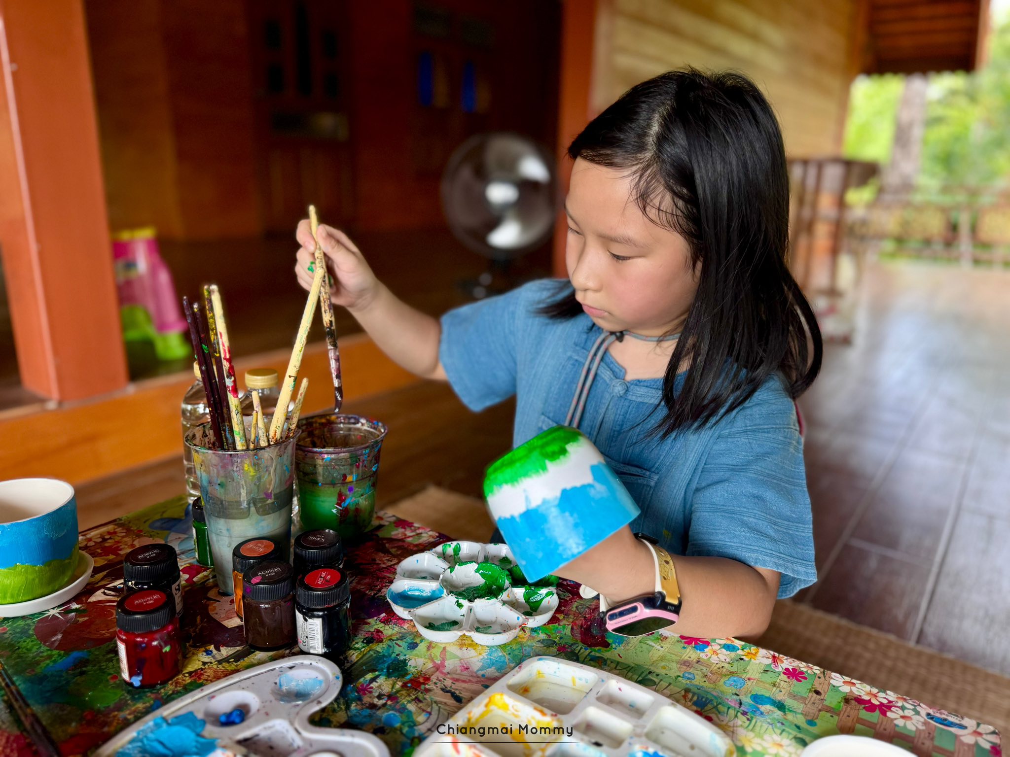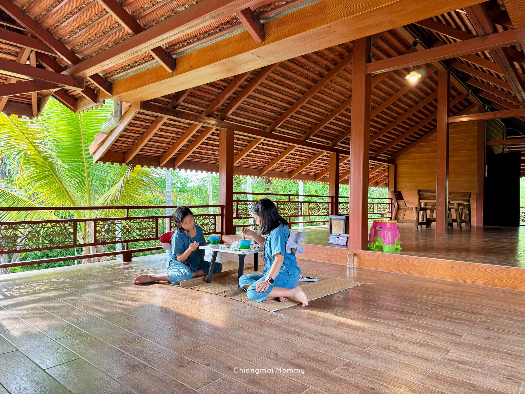 Paint Pot Plants ระบายสีกระถางพร้อมปลูกต้นกล้าออแกนิค พี่ๆสต๊าฟจะพาเราไปนั่งทำงานที่บ้านเรือนไทยประยุกต์ ลมพัดโกรกเย็นสบาย ซึ่งที่นี่มีสนามเด็กเล่นด้วยนะคะ