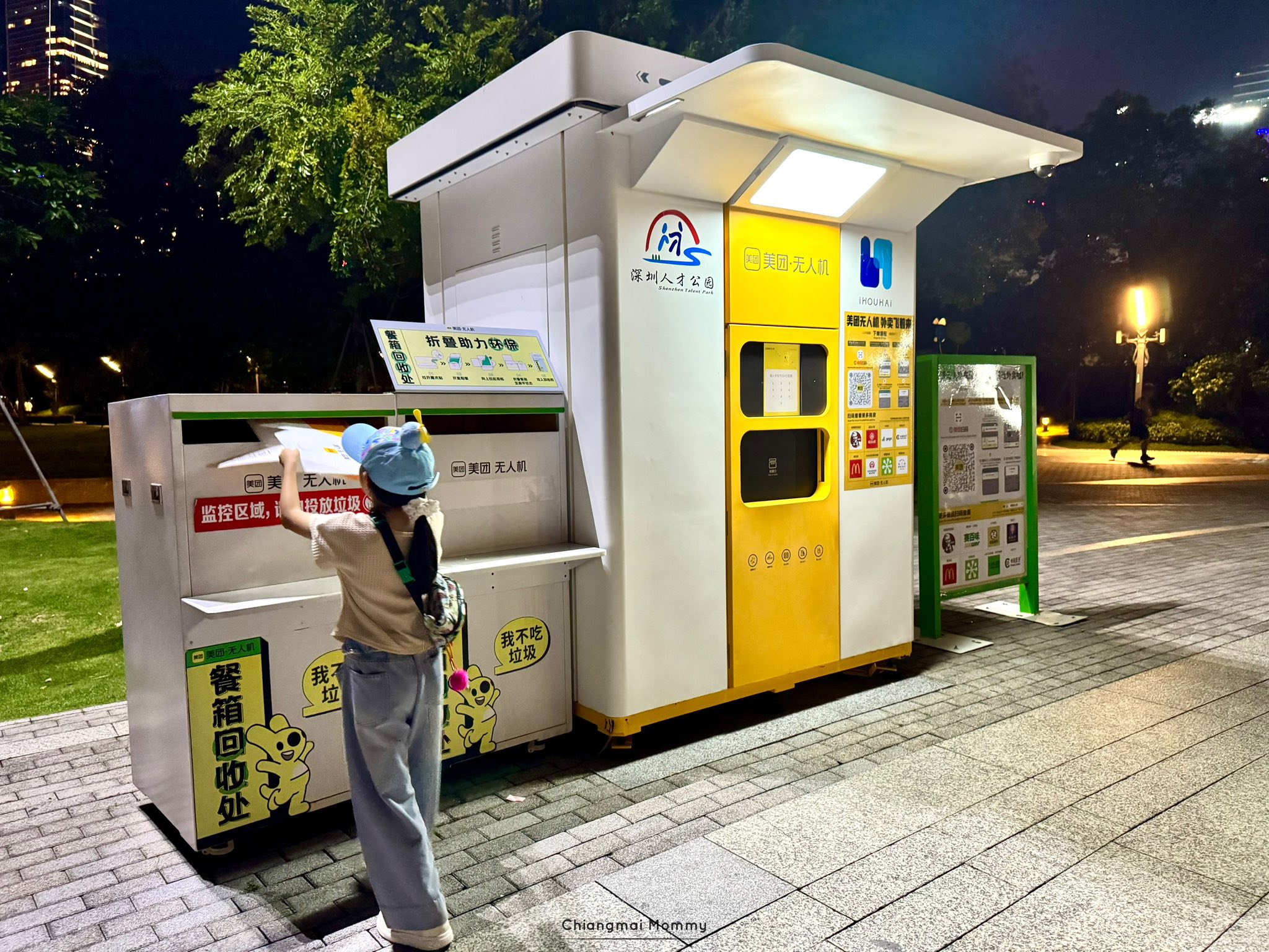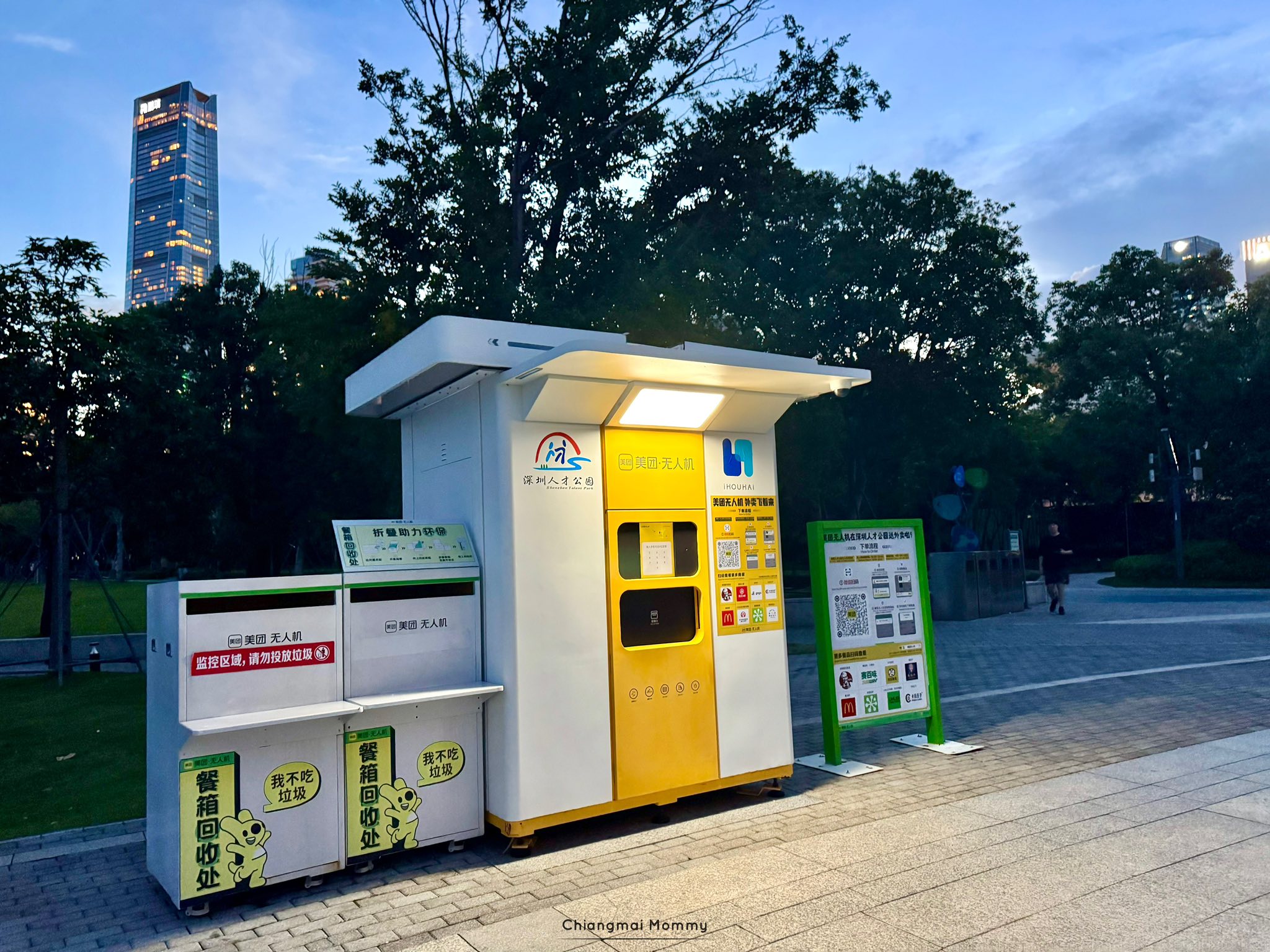 ดังนั้นเดินไปสั่งอาหาร Dilivery ดีกว่า!! เมืองเซินเจิ้นถือว่าเป็น เมืองแรก ๆ ของจีนที่มีบริการส่งอาหารด้วยโดรน ซึ่งจะมีแค่บางเขตเท่านั้นค่ะ ไหนๆมาถึงที่ก็ต้องลองค่ะ เราใช้แอพ Meituan 美团 ในการสั่ง ถ้ายังไม่เคยใช้ก็สามารถสแกนหน้าตู้ได้เลย ด้านในแอพจะสามารถเลือกได้หลายร้านที่เข้าร่วมบริการ เด็กๆอยากกิน Mcdonald ก็จัดไปค่ะ ![]()