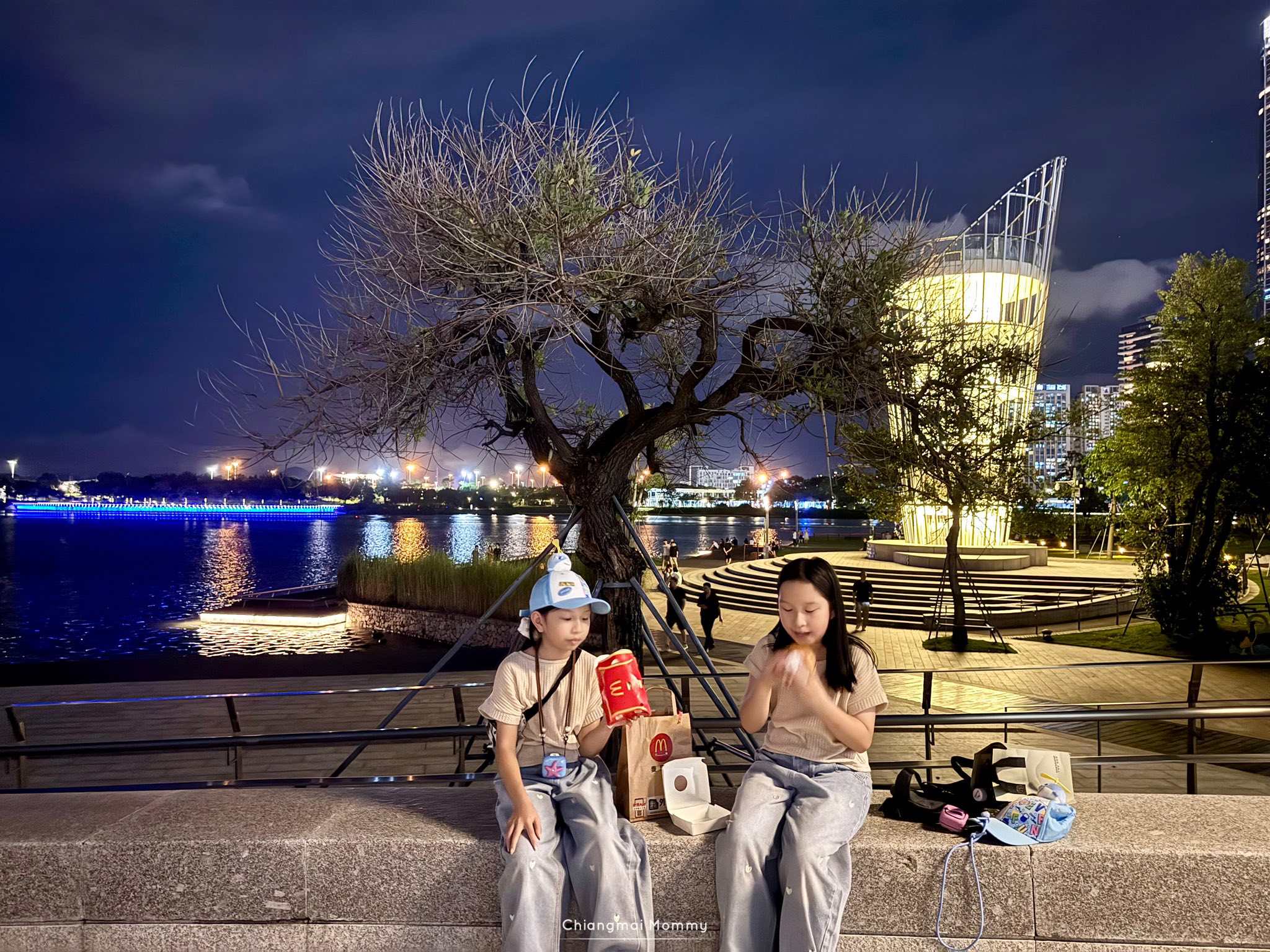 เมื่อหยิบอาหารออกแล้วต้องนำกล่องไปคืนที่ตู้นะคะ อาหารยังร้อนๆอยู่เลยค่ะ แล้วก็นั่งทานอาหารแถวๆนั้น ดูไฟสวยๆยามค่ำคืนก่อนกลับโรงแรม