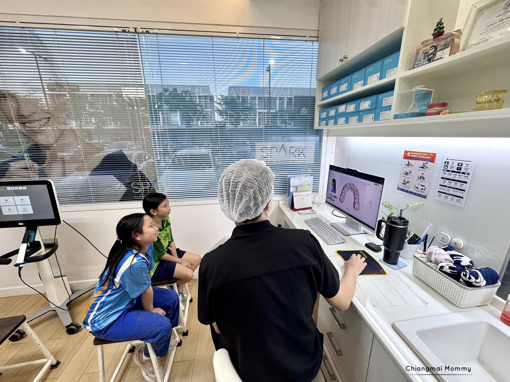 #ฟังผล : ประมาณ 1 อาทิตย์เราก็เข้ามาฟังแผนการจัดฟัน วันนี้คุณหมออธิบายและเปิดให้ดูขั้นตอนการจัดฟันของลูกแต่ละคน ซึ่งการรักษาก็จะแตกต่างกันนะคะ เครื่องมือจะทำหน้าที่ดึงฟันให้เรียงกันตามแผนที่คุณหมอออกแบบไว้แต่ละสัปดาห์ พอเห็นภาพการเคลื่อนของฟันทีละนิดๆค่อยๆเคลื่อนเรียงกันสวยครบ ว้าวเลยค่ะ แม่เพิ่งเข้าใจหลักการทำงานของนวัตกรรมนี้ จุดเด่นคือสามารถทำนายการเคลื่อนของฟันตั้งแต่เริ่มรักษาจนจบคอร์ส ทำให้รักษาฟันซ้อนเกง่ายขึ้น พอเราโอเคคุณหมอจะส่งแผนนี้ไปบริษัท SPARK ที่อเมริกาให้ผลิตเครื่องมือจัดฟันตามที่วางแผนไว้ค่ะ วันนี้คือใช้เวลาไม่นานคุยแป๊บๆเสร็จค่ะ
