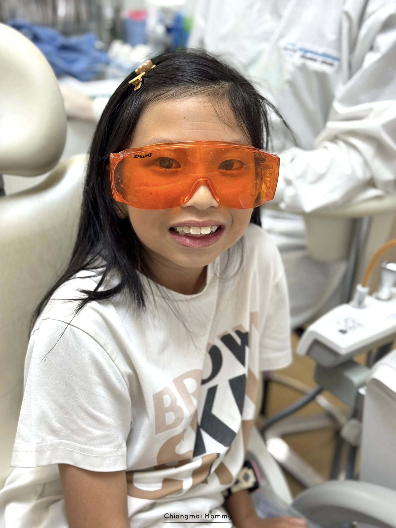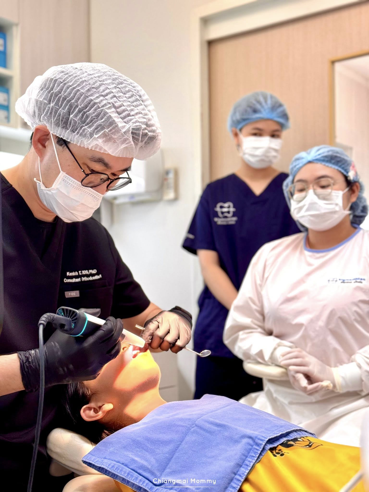 #เริ่มจัดฟัน พอเครื่องมือส่งมาถึงเชียงใหม่ ก็ได้เวลาจัดฟันจริงๆแล้ว เด็กๆตื่นเต้นกลัวเจ็บกันมาก เพราะเป็นครั้งแรก ไม่รู้ต้องทำอะไรบ้าง ปรากฏชิวมาก คุณหมอแค่ขัดและทำความสะอาดฟันให้ จากนั้นติดปุ่มที่ฟัน (attachment) คล้ายๆทำเล็บเจลค่ะ แปะกับฟัน แล้วมีแสงสีม่วงมาส่อง ไม่มีบาดแผล อ้าปากกว้างๆอย่างเดียว จบ!! ไวมาก
