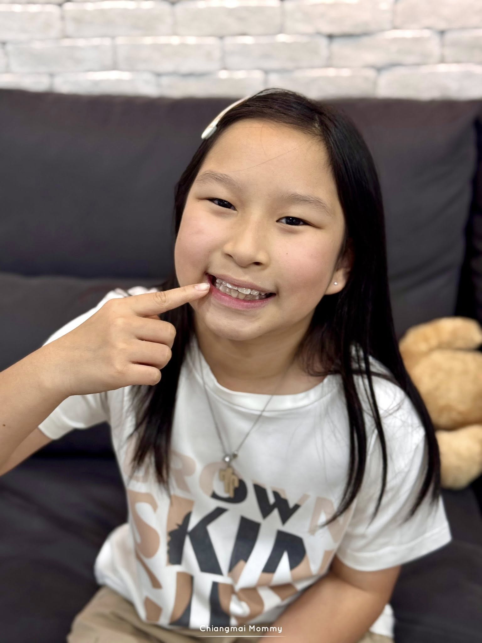 สอนไม่นาน เด็กๆสามารถทำเองได้ค่ะ ซึ่งเครื่องมือจะเปลี่ยนทุก 7 วัน ใส่ตลอดอย่างน้อย 16 ชั่วโมงต่อวัน ระหว่างที่จัดฟันลูกสามารถแปรงฟัน ทานข้าวแบบปกติทั่วไป แค่ถ้าจะทานข้าวก็ต้องถอดใส่ในกล่องที่คุณหมอจัดมาให้ค่ะ กล่องเล็กๆพกง่ายมีกระจกน่ารักๆ เด็กๆใส่เครื่องมือแล้วการพูดก็ธรรมชาติ ไม่อมลิ้น ถ้าไม่สังเกตก็มองไม่ออก ยกเว้นบางมุมที่เห็นว่าฟันจะเหมือนถังหูลู่ มีอะไรใสๆเคลือบอยู่